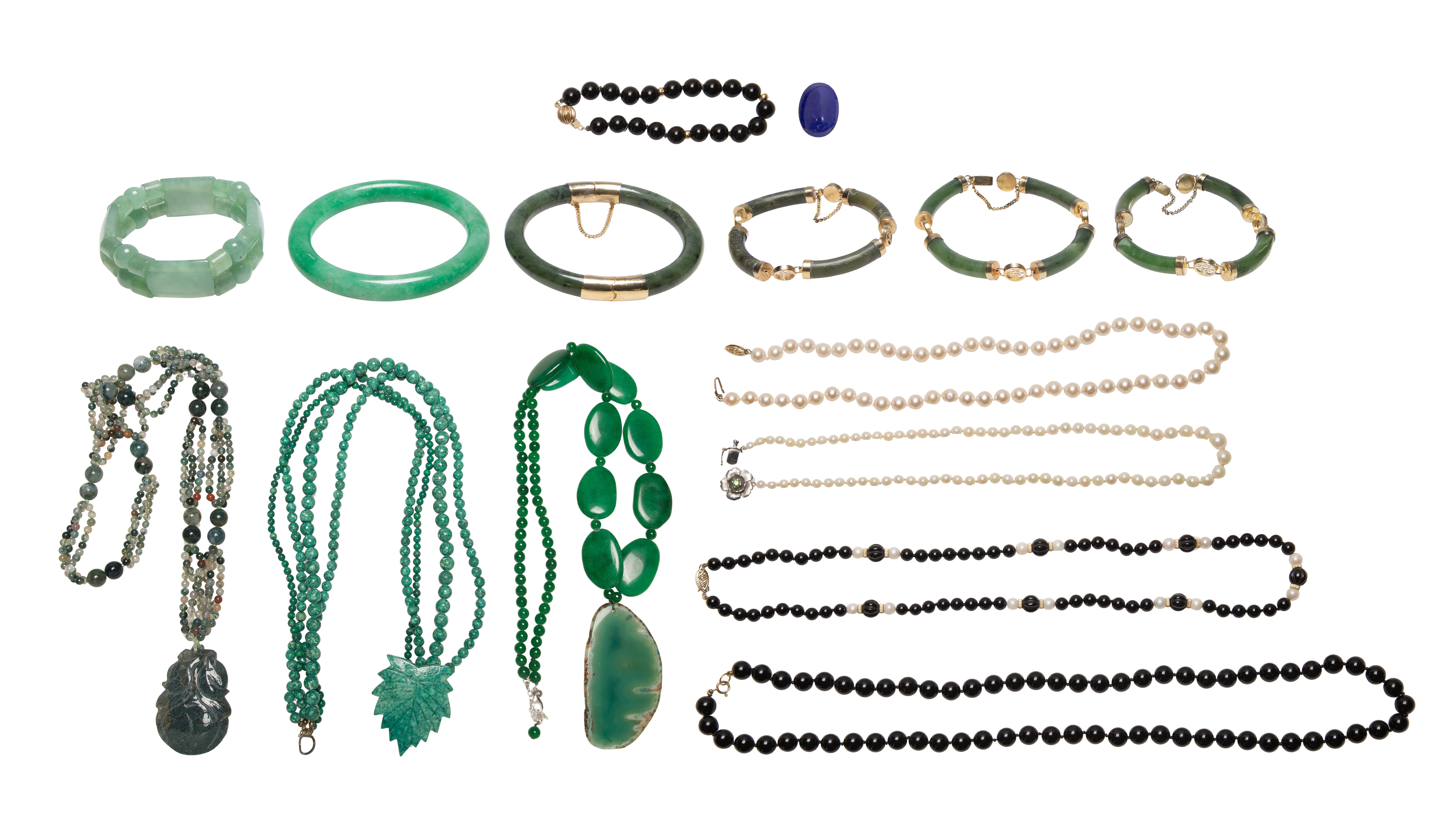 (15) items including (5) beaded necklaces having spacers and clasps (marked ’14k’) as well as various stone bracelets and necklaces, some jadeite jade