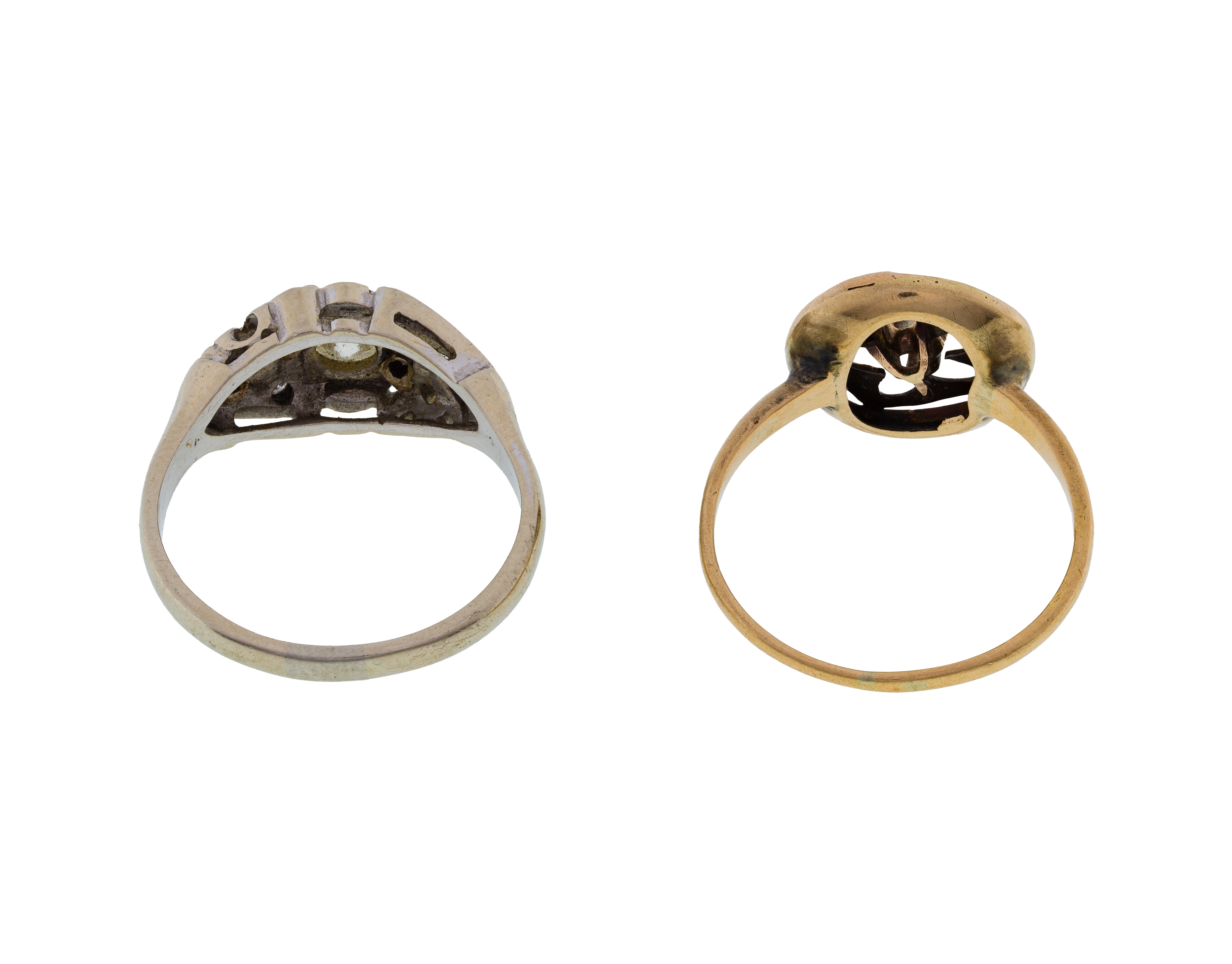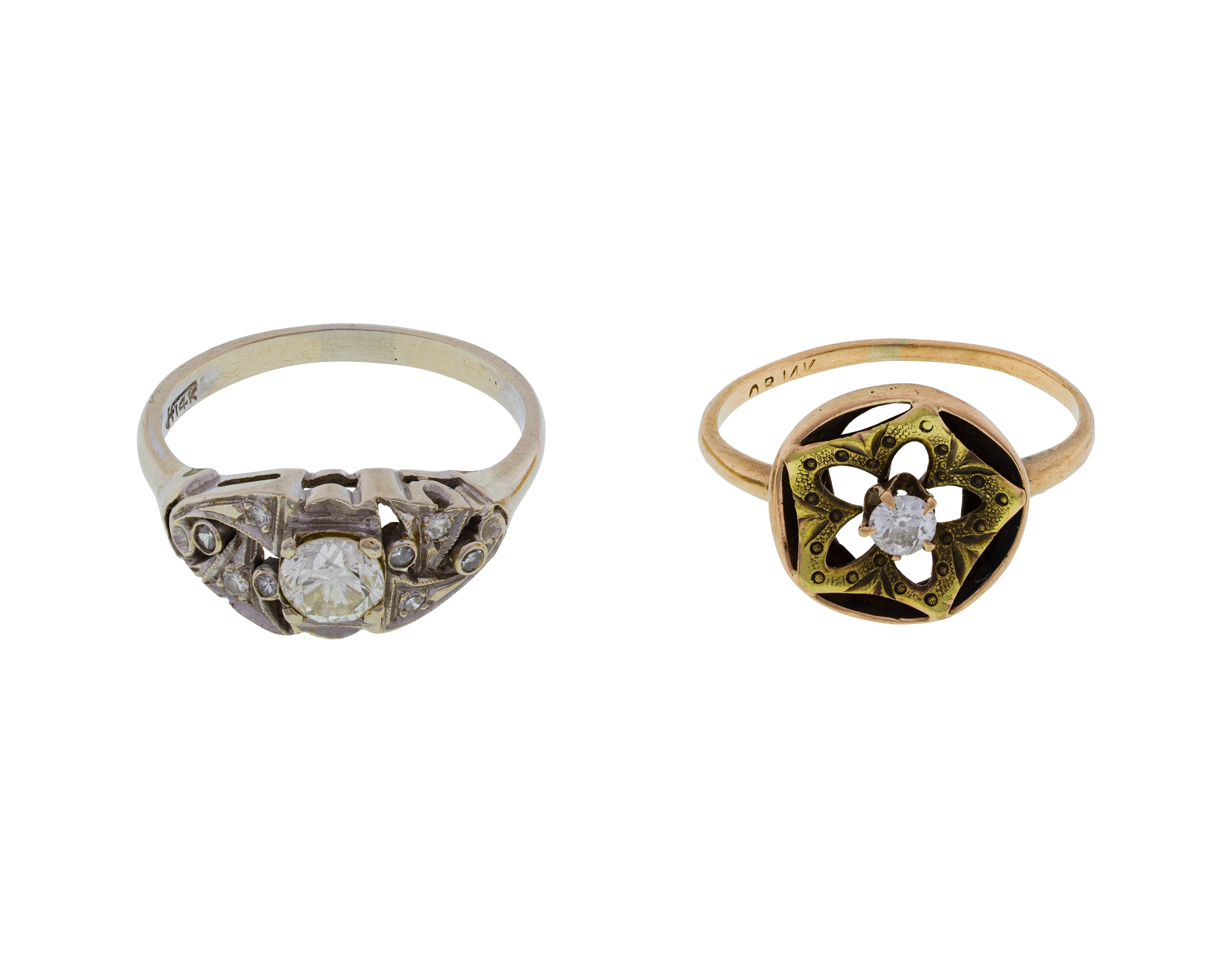 (2) items including a center round cut diamond having pave accents in an open work setting and a center round cut diamond in a floral setting (marked ’14k’)