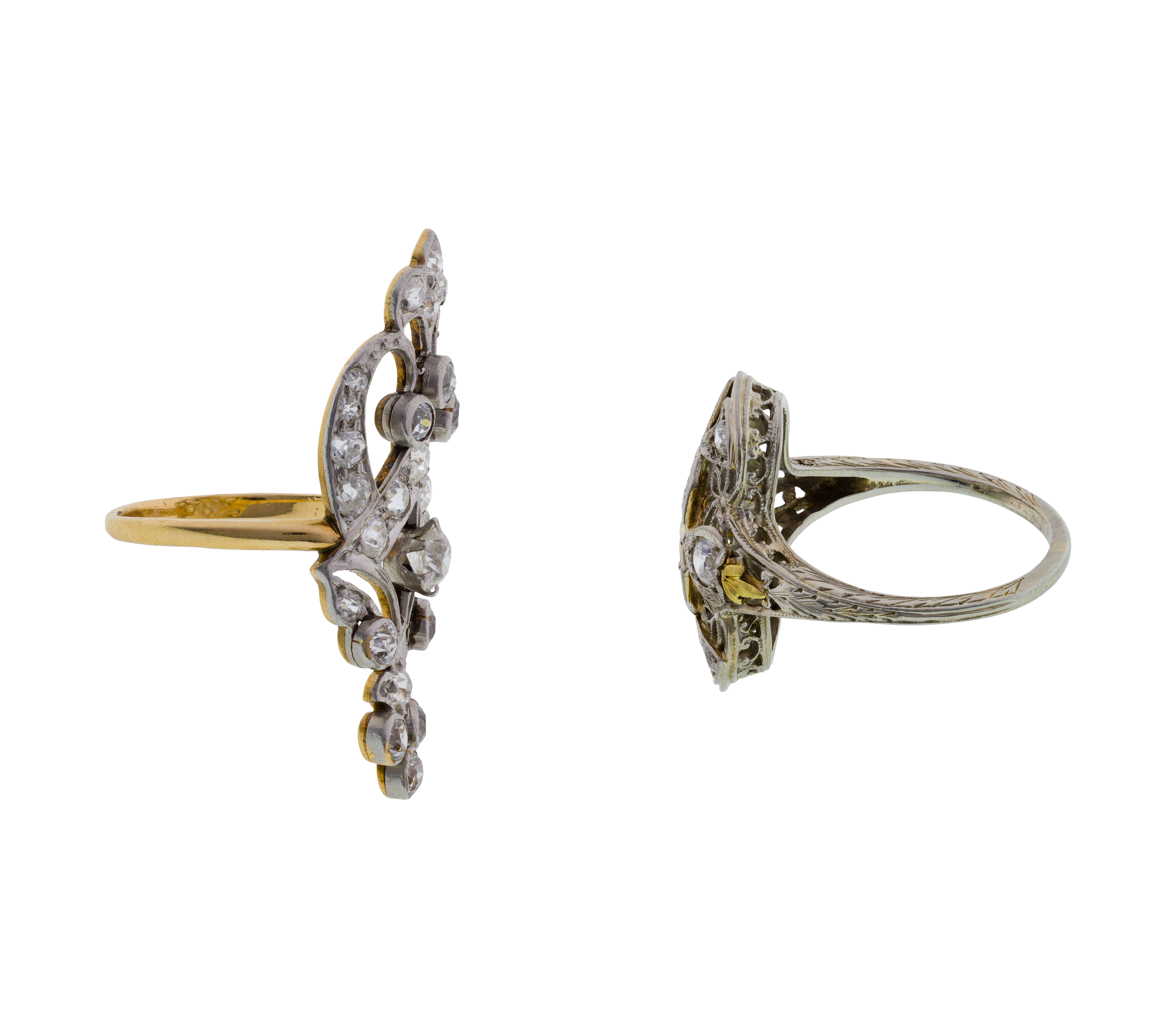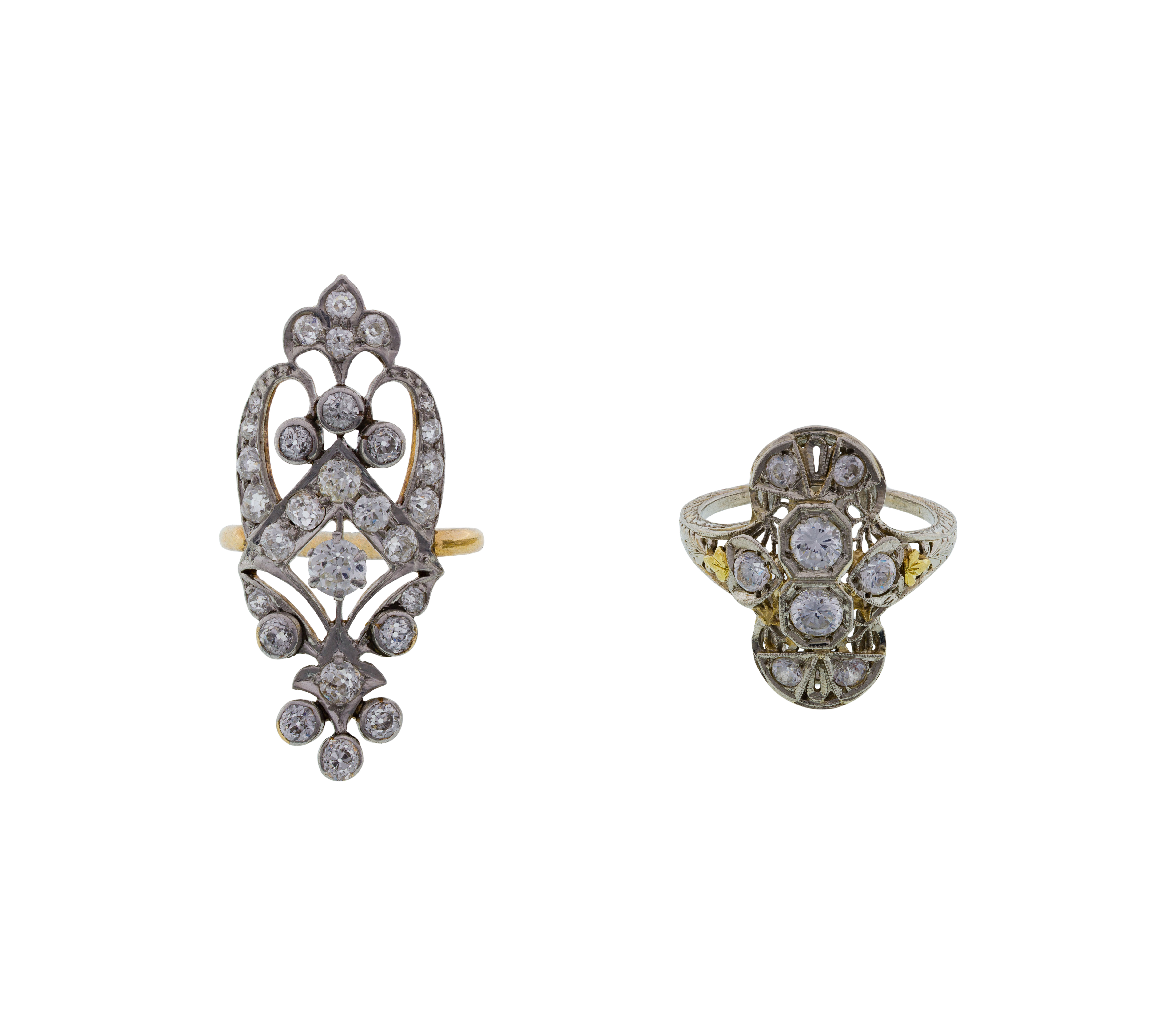 (2) items including a dinner ring having a pierced filigree design, four center round cut diamonds and flanked by accent diamonds (marked ’18k’) and an elongated navette setting having a center round cut diamond surrounded by accent diamonds of various sizes (unmarked 14k)
