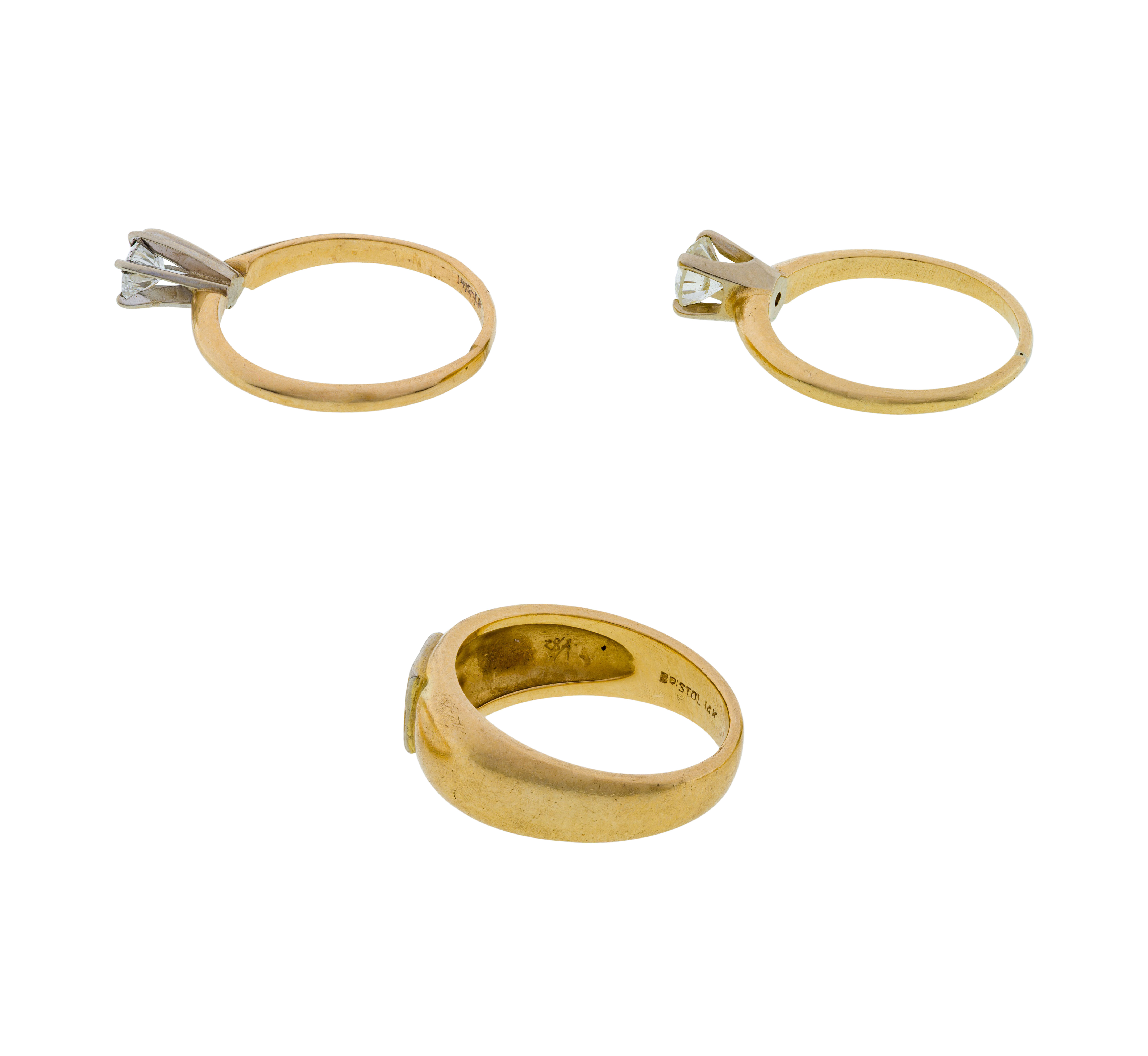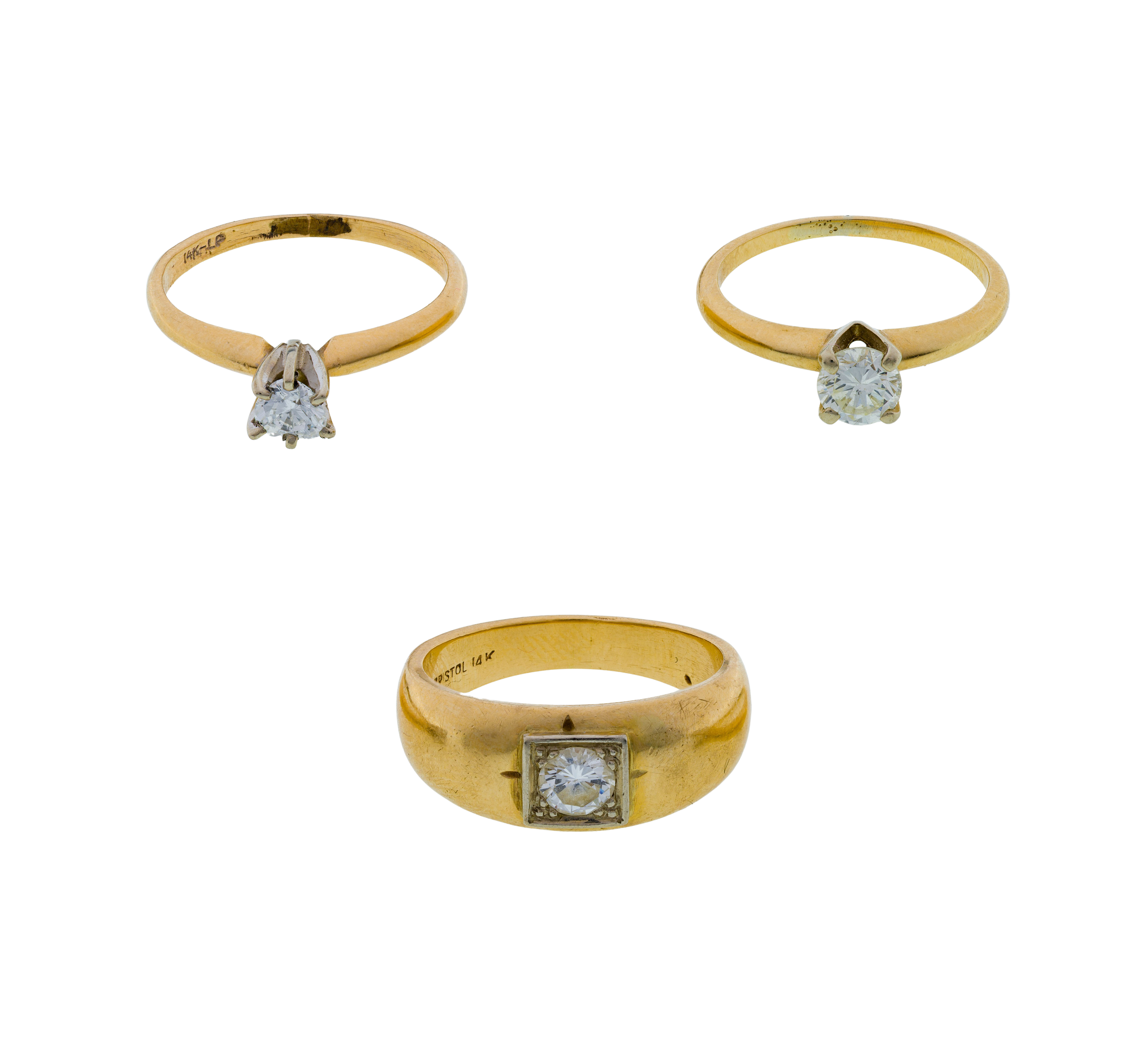(3) items including (2) solitaire engagement style having center round cut diamonds and a band style having a square accent and round cut diamond (most marked ’14k’)