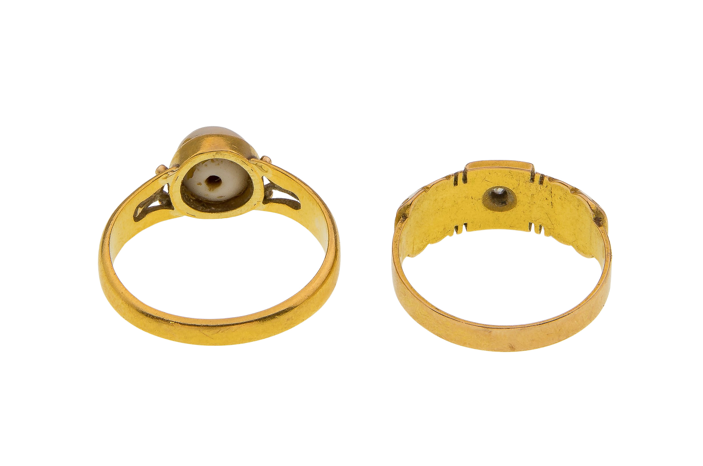 (2) items including a circular solitaire setting having an approximately 7mm cabochon pearl (marked ’22’) as well as a multi-stone rectangular cluster band having seed pearls and diamond center (marked ’15’)