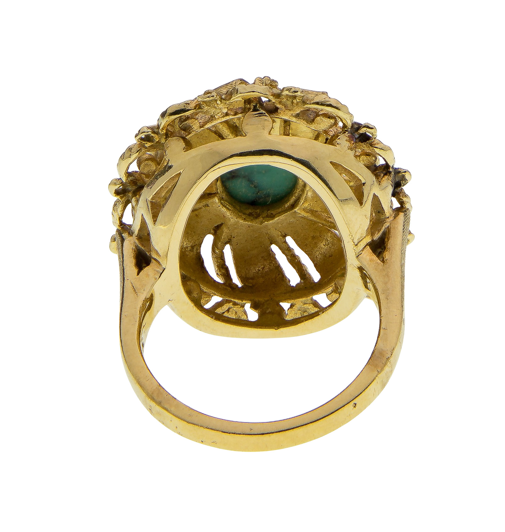 A cocktail ring having an oval cut cabochon turquoise in a radial setting