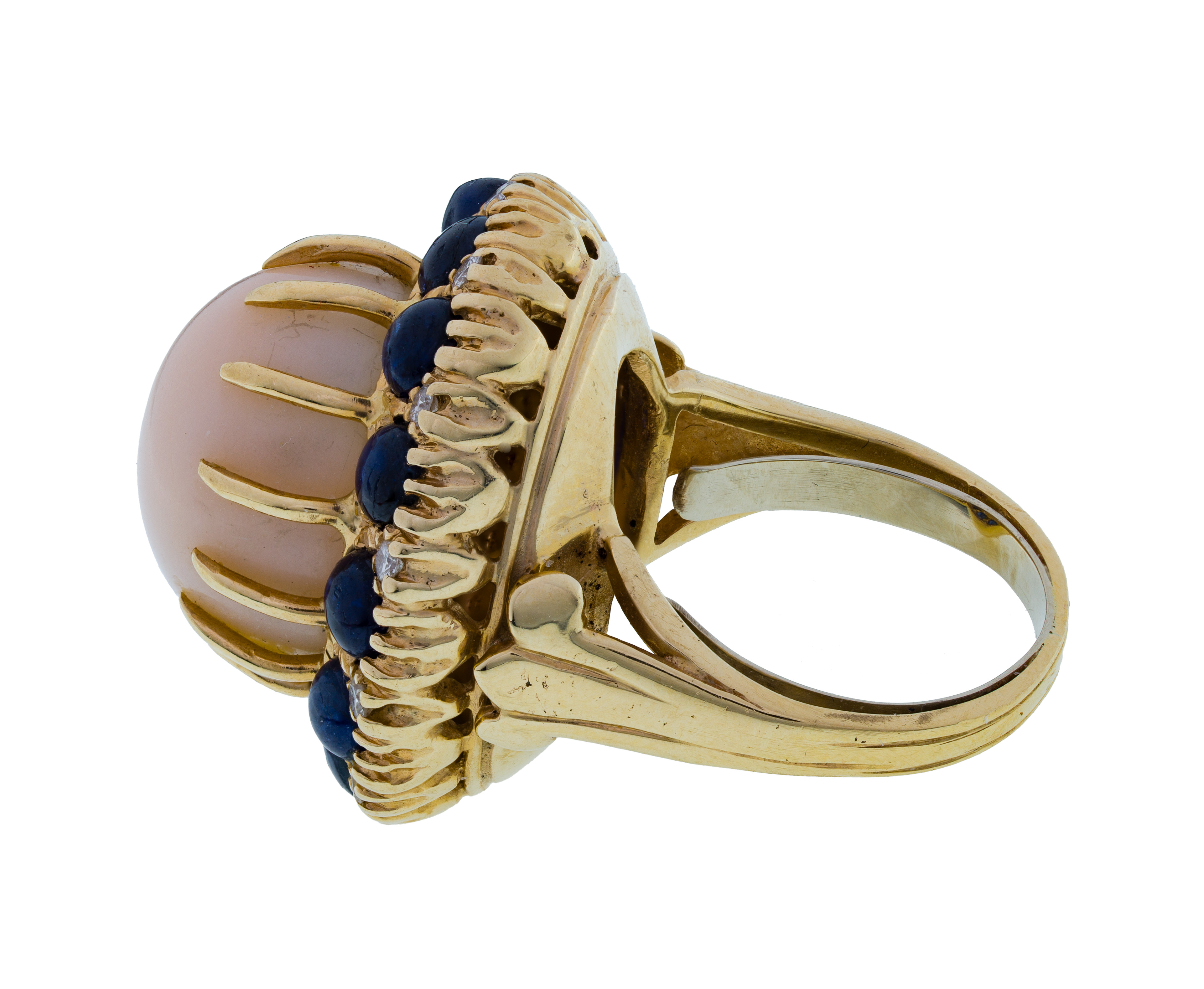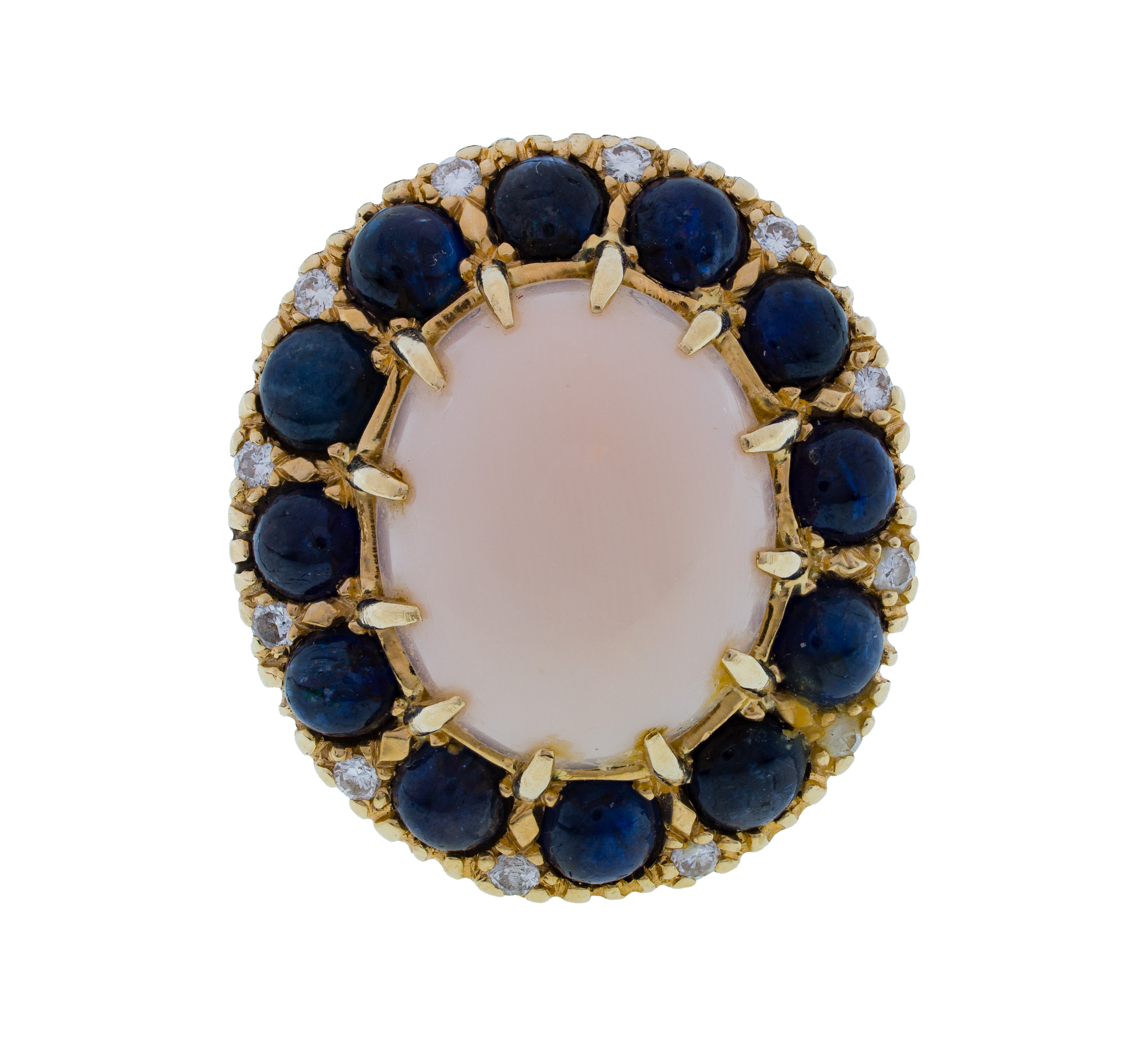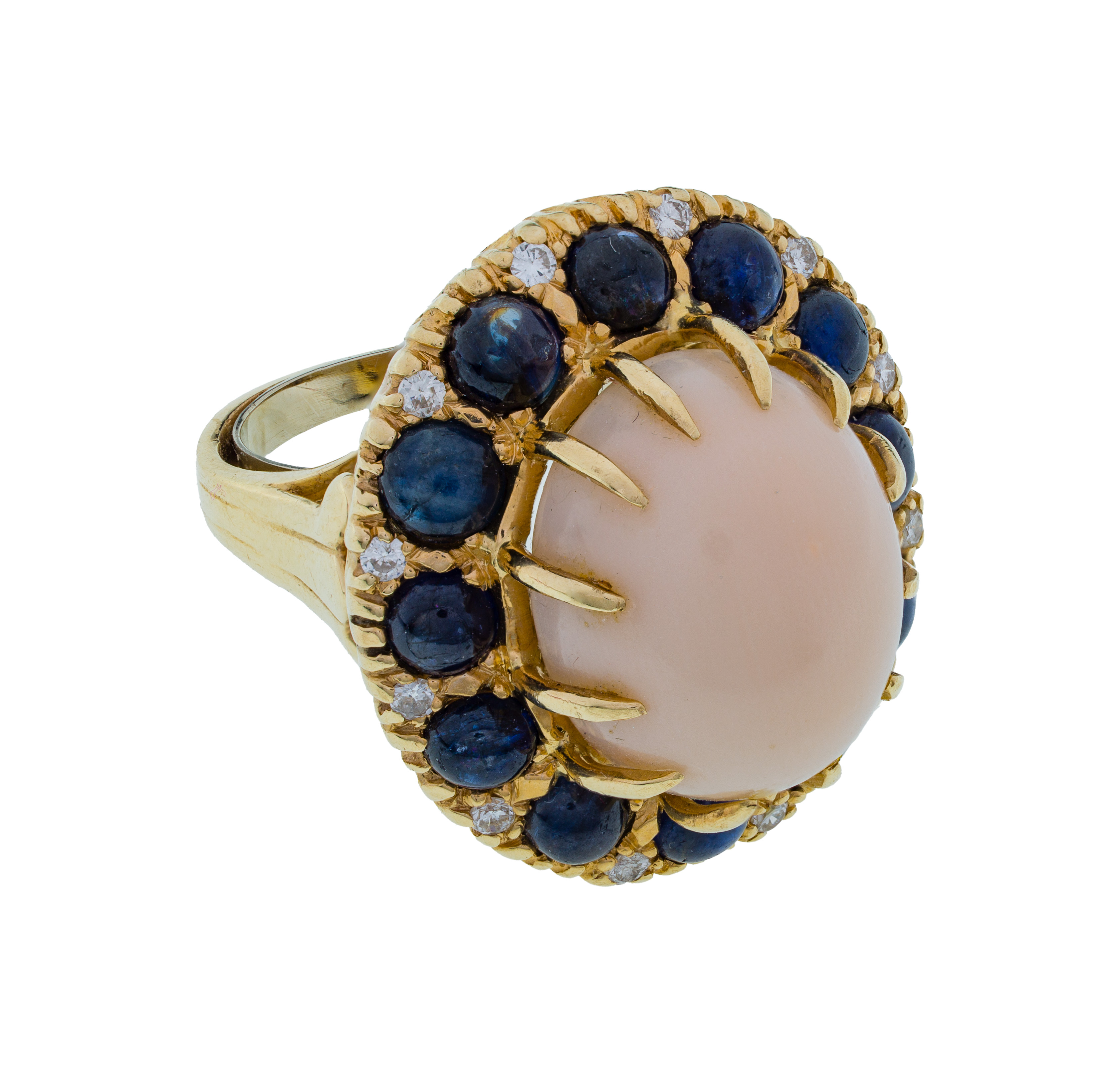 A cocktail dome style ring having an oval cut cabochon coral center stone (approximately 17mm x 14mm) encircled by round cut sapphires and accented in round cut diamonds (marked ’14k’)