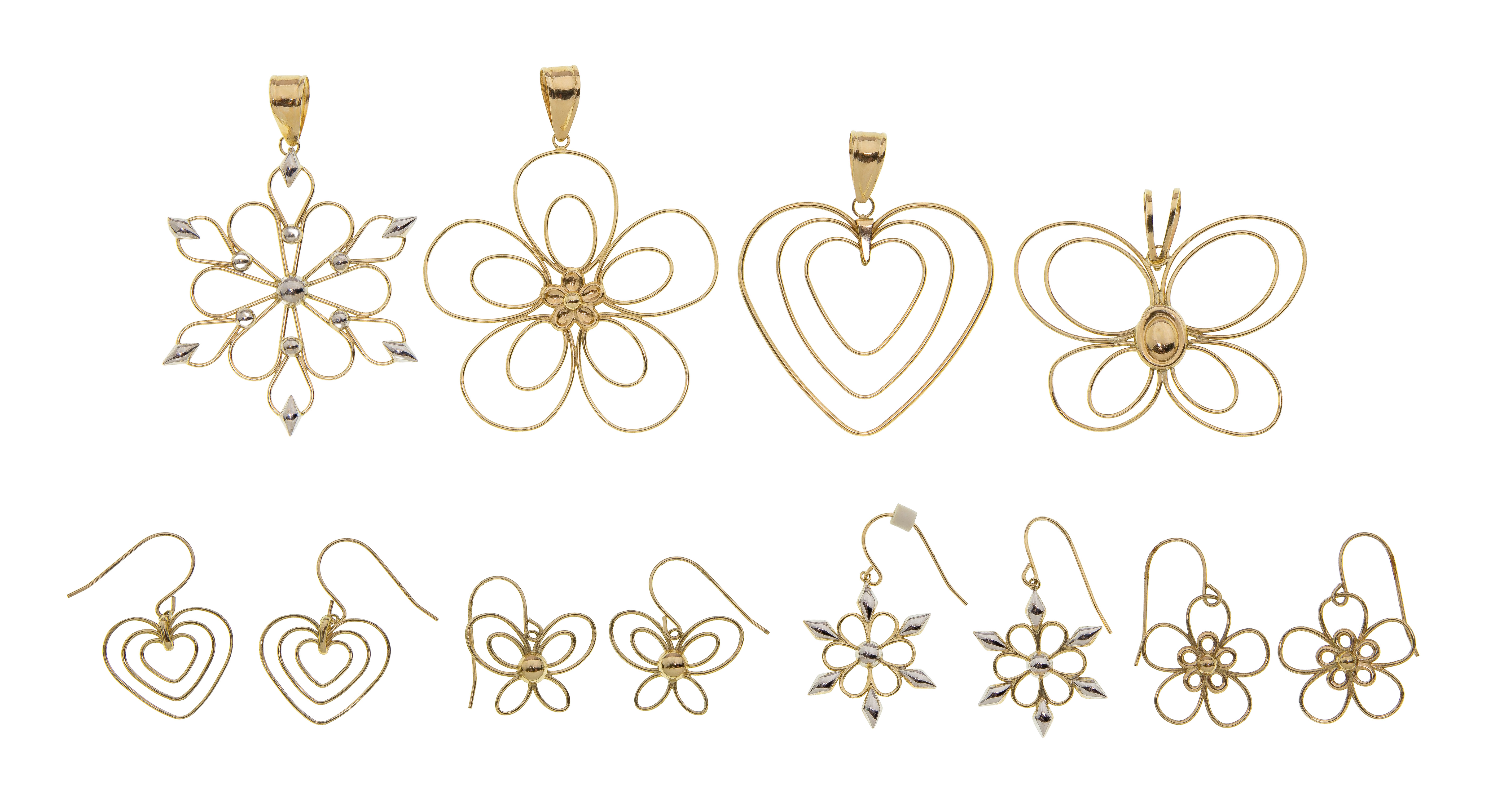 (8) items including (4) wire formed pendants and (4) pairs of matching pierced earrings (most marked ’14k’)