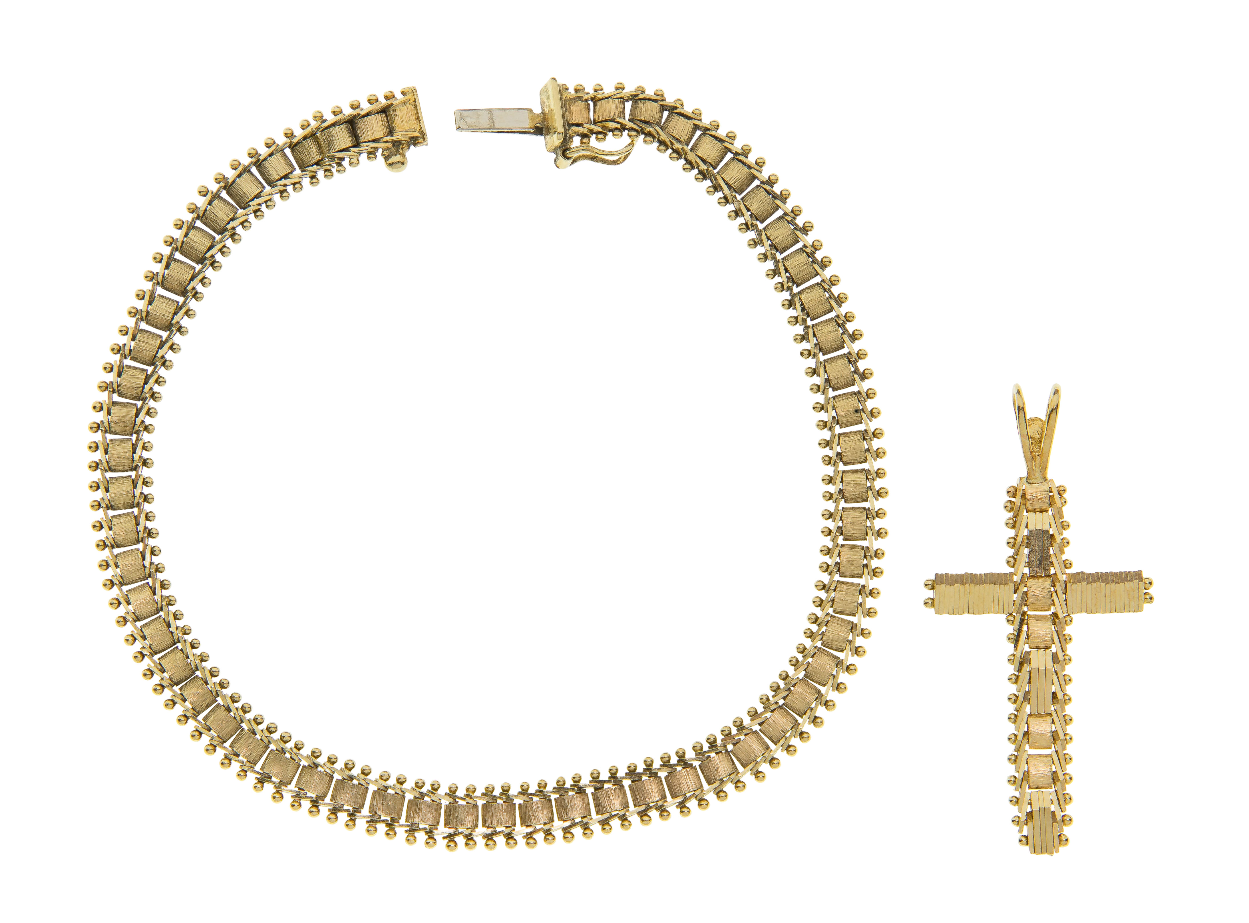 (2) items including a railroad style link bracelet and matching cross pendant (both marked ’14k’)