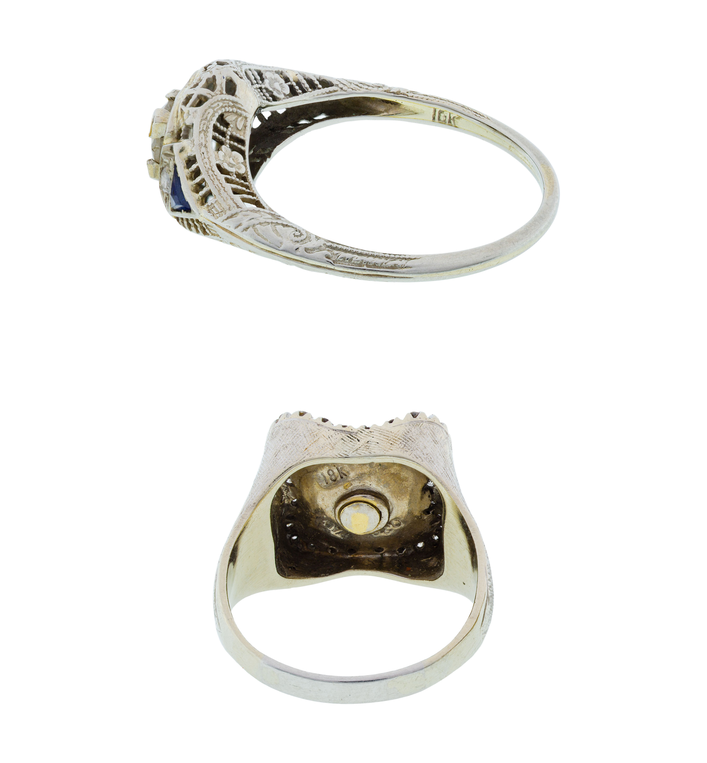(2) items including a round cut diamond flanked by two trillion cut sapphires as well as a square top having black enamel and a center of round cut diamonds set as a flower (marked ’18k’ / ‘750’)