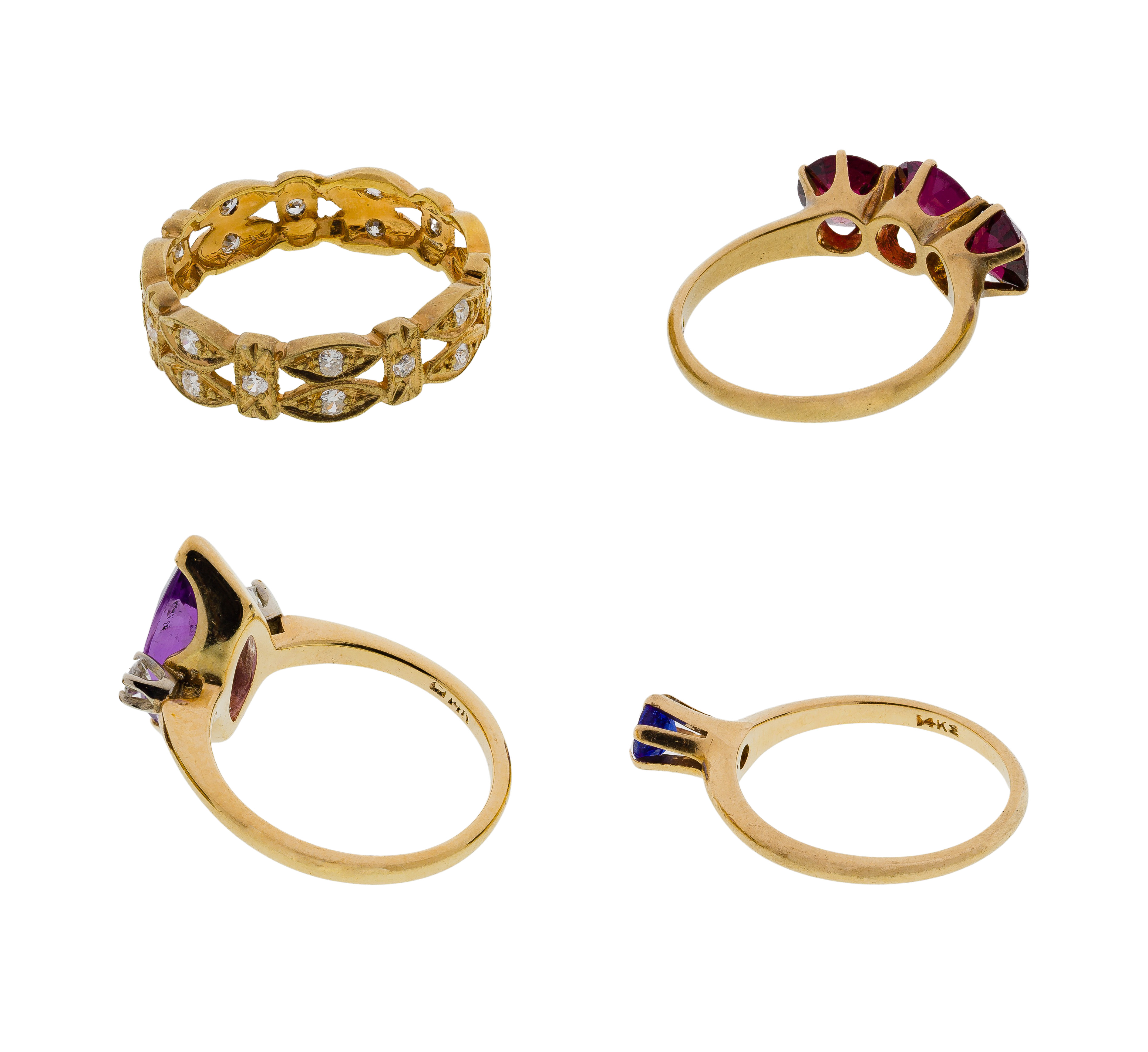 (4) items including an amethyst, a garnet, a tourmaline and a diamond accented band (most marked ’14k’)