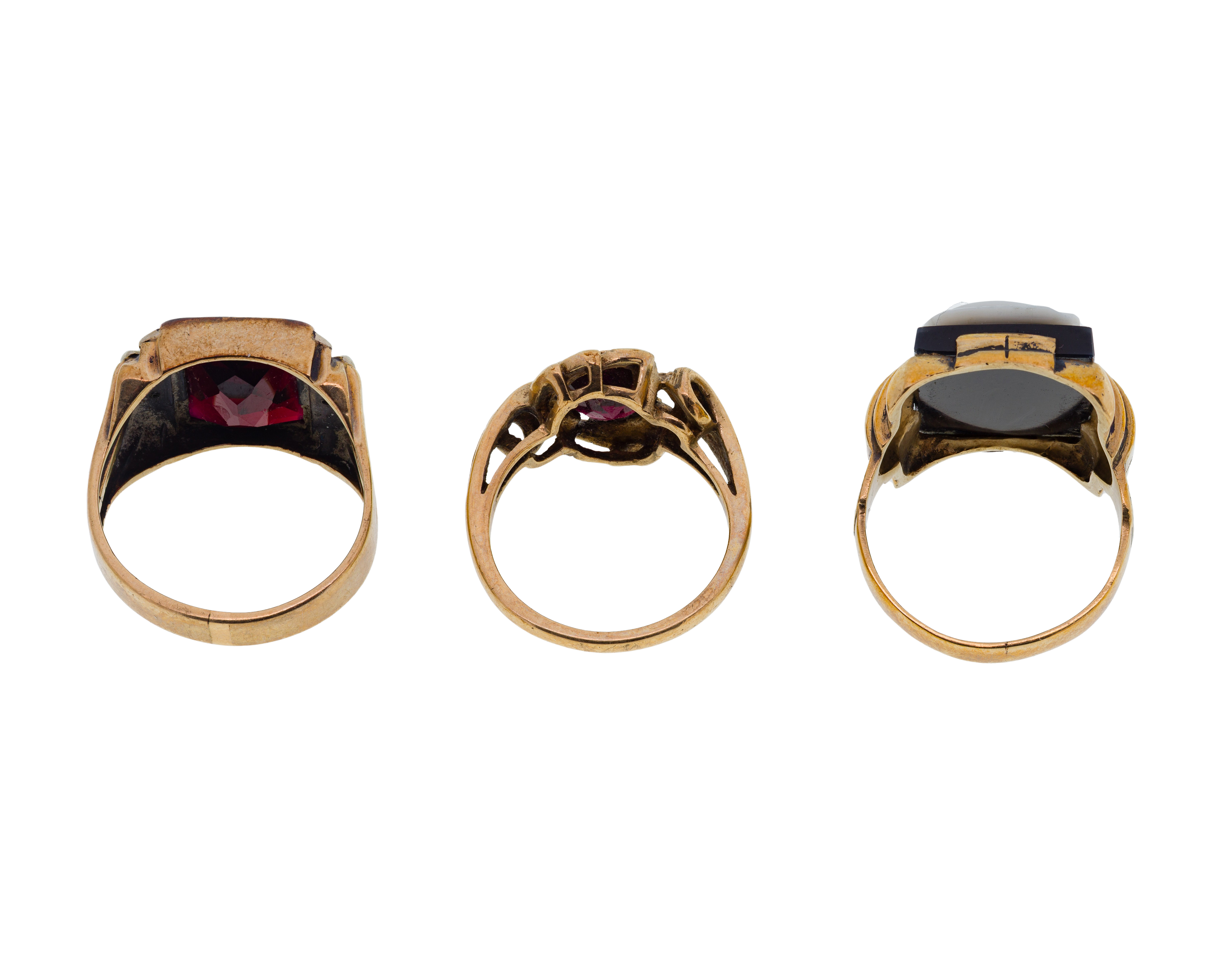 (3) items including a carved onyx (marked ’10k’) and (2) garnet (unmarked 9k)