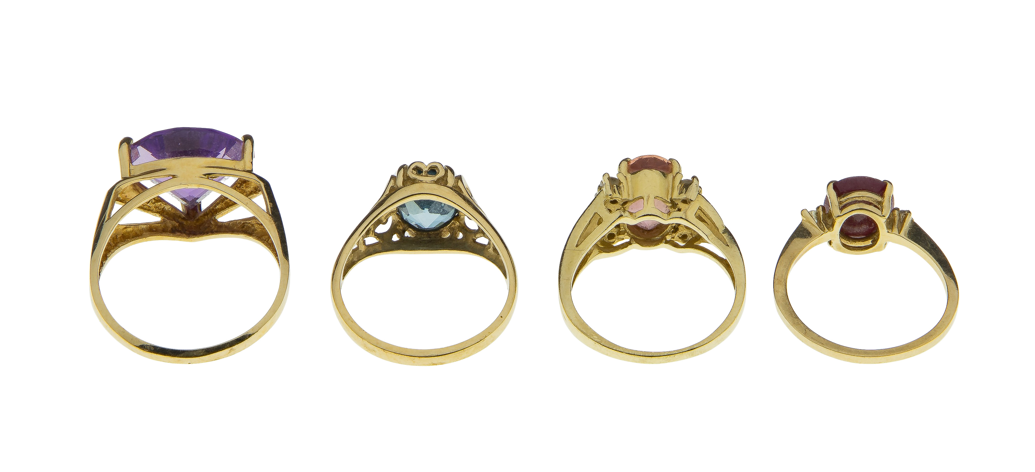 (4) items of various shapes, sizes, designs and gemstones including amethyst, ruby and topaz (all marked ’14k’)