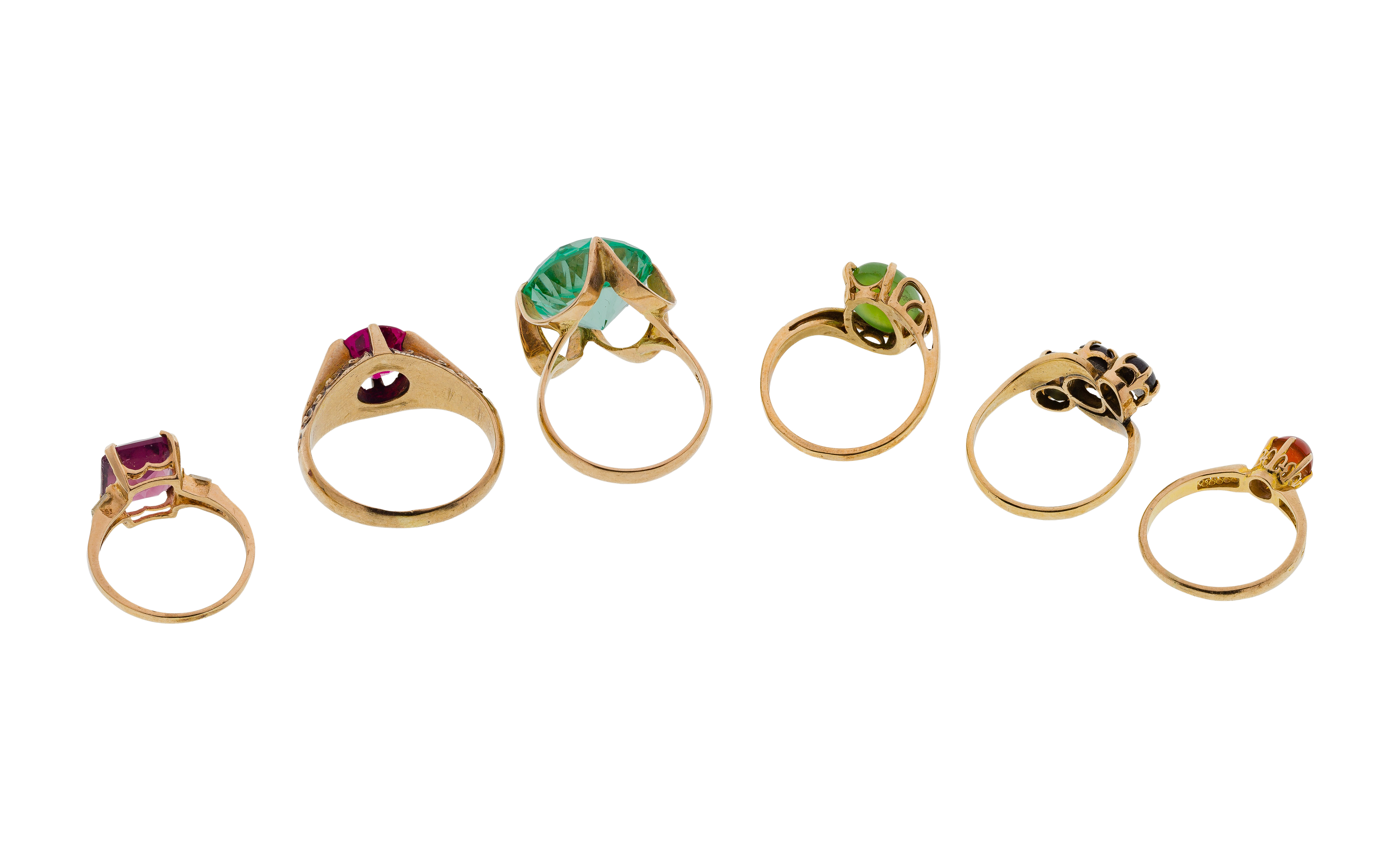 (6) items having various stones including cat’s eye, coral and garnet (most marked ’10k’)