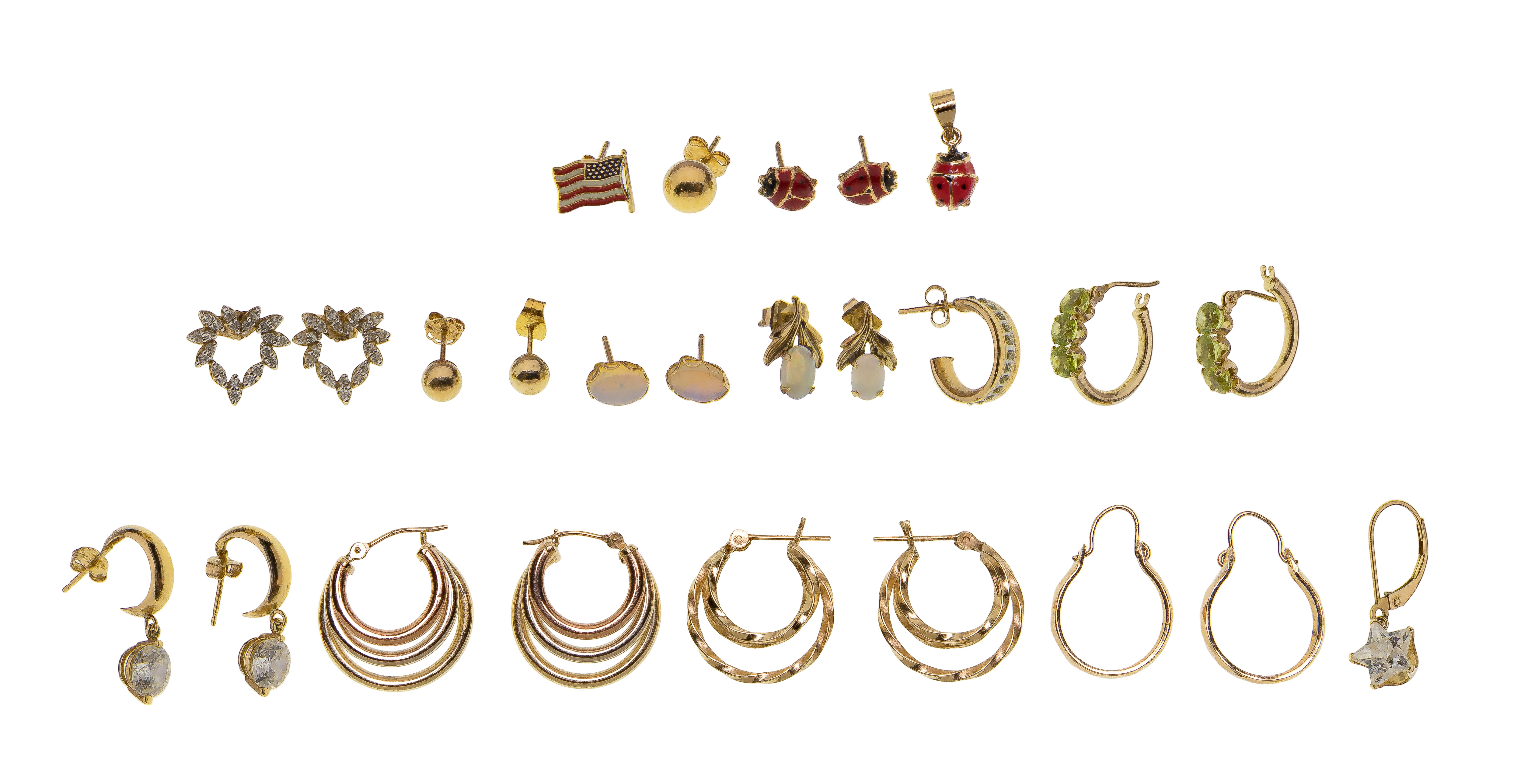 (15) total items including (10) pairs of pierced earrings as well as (3) single earrings; together with a ladybug pendant and a lapel pin (all marked ’14k’)
