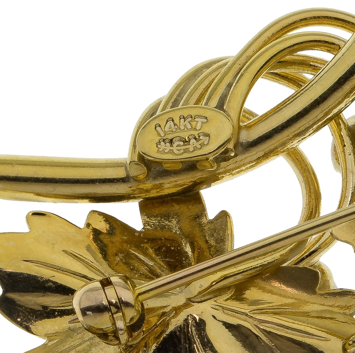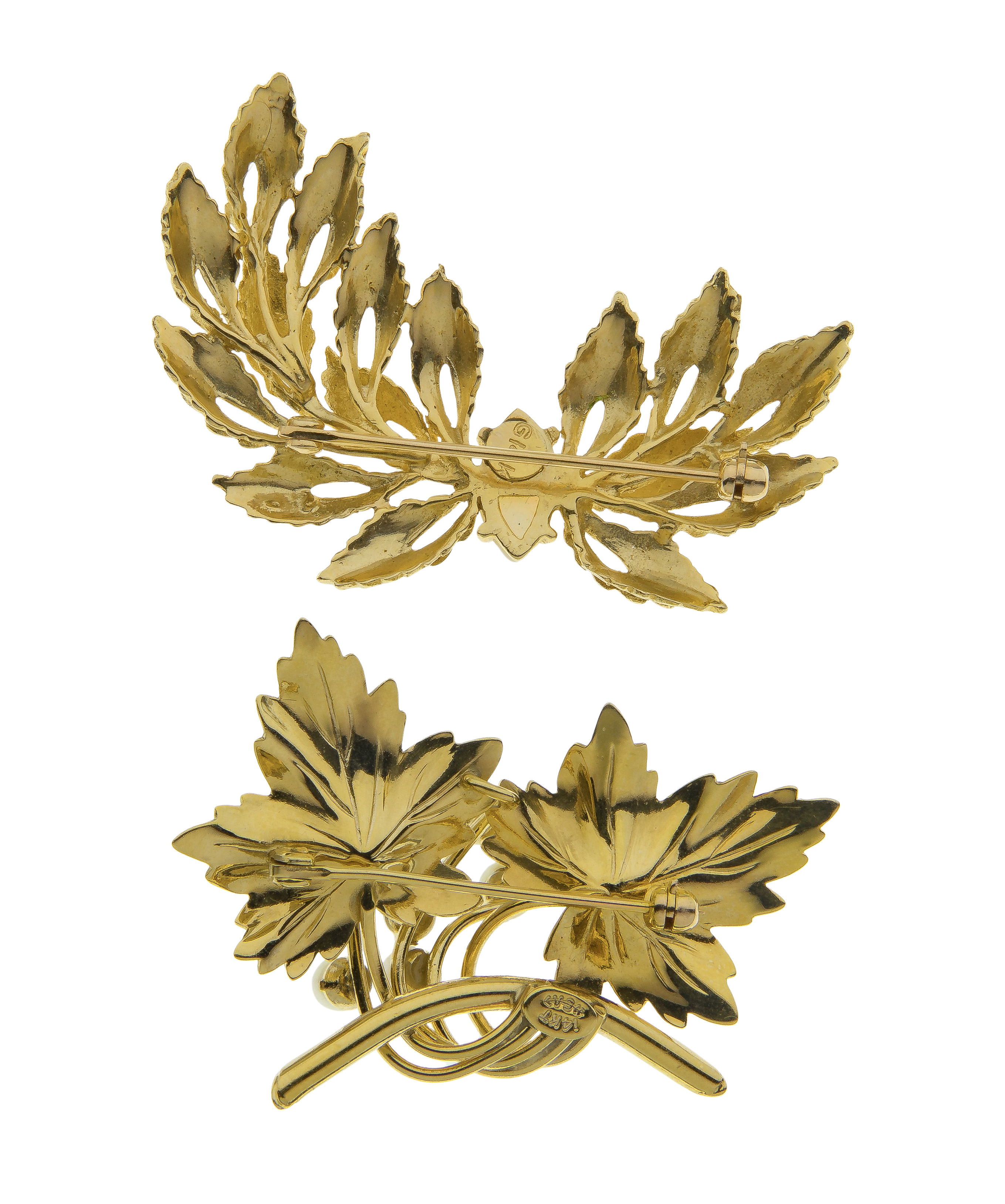(2) brooches having a foliate motif, including an opal and a pearl marked ‘Carl Art’ (both marked ’14k’)