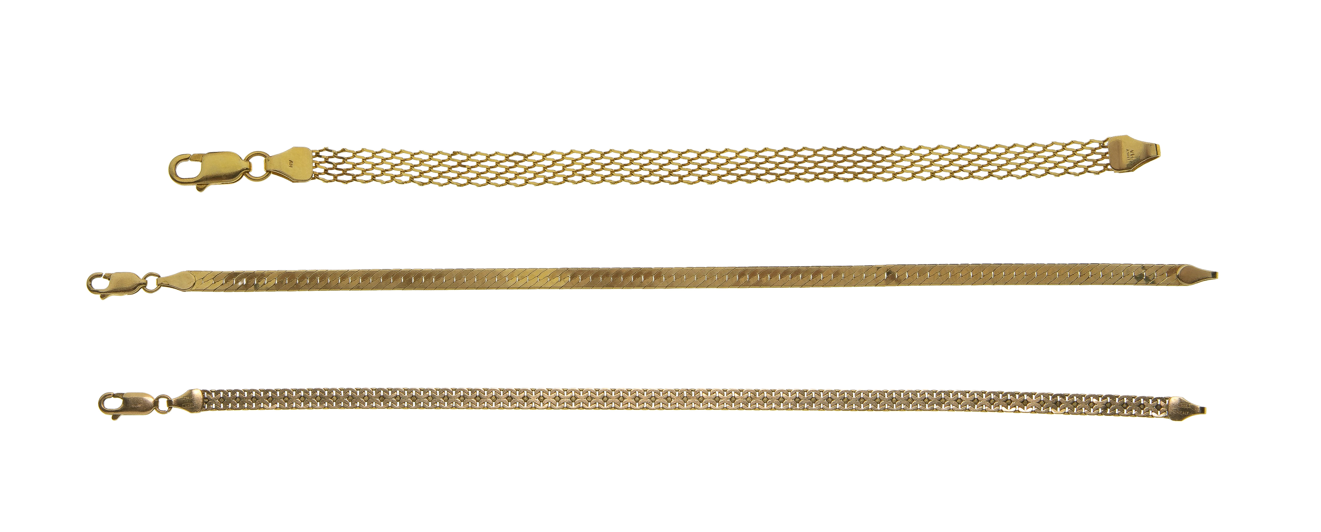 (3) chain style items including a herringbone, an X-style and a mesh style (all marked ’14k’)