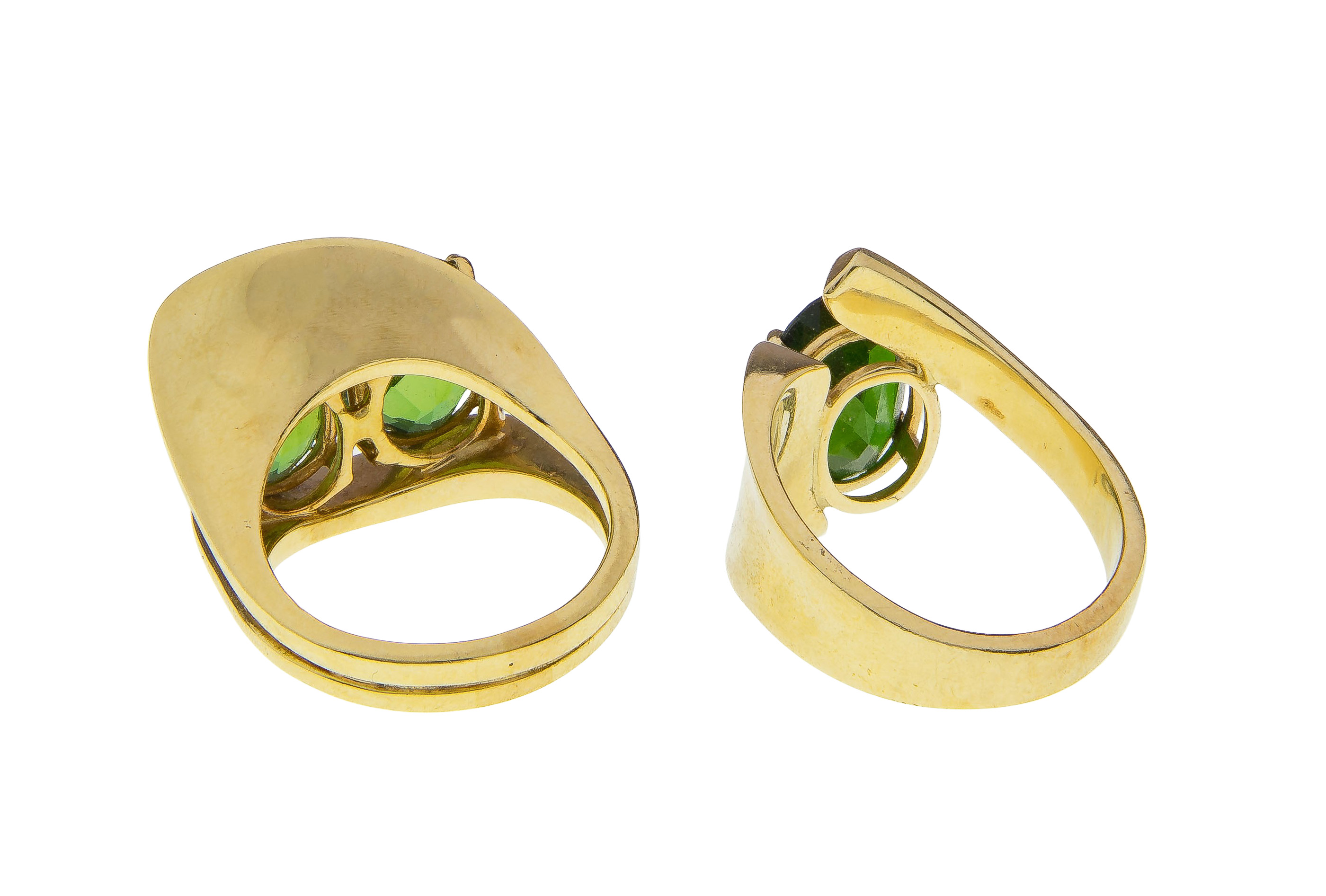 (2) items including a cocktail ring having two oval cut emeralds in a free form setting and an oval cut emerald in a crossover setting (both marked ’14k’)
