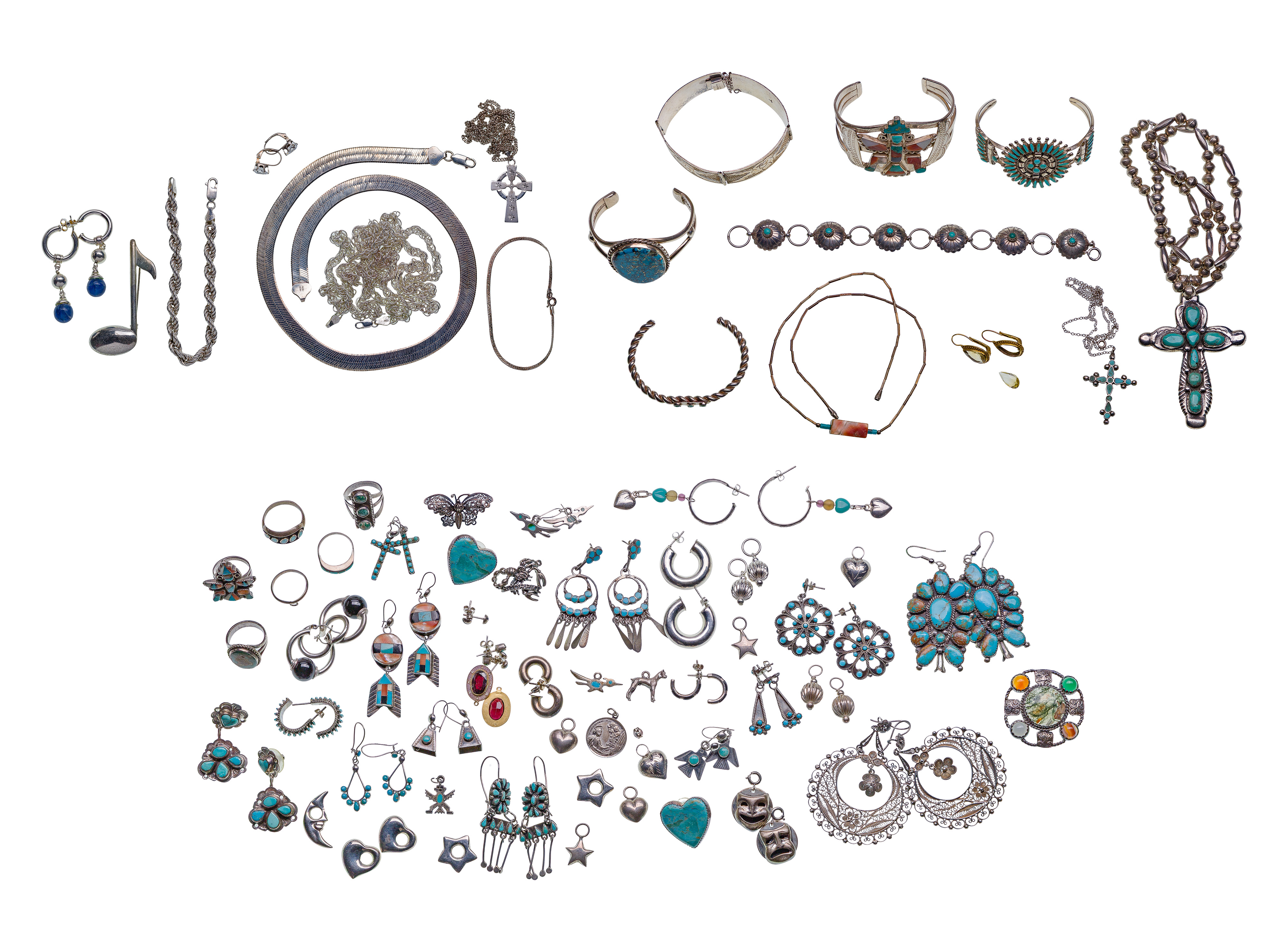 Including bracelets, earrings, necklaces, pendants, rings and pins (most unmarked 0.925 / 0.830 / 0.800 silver)