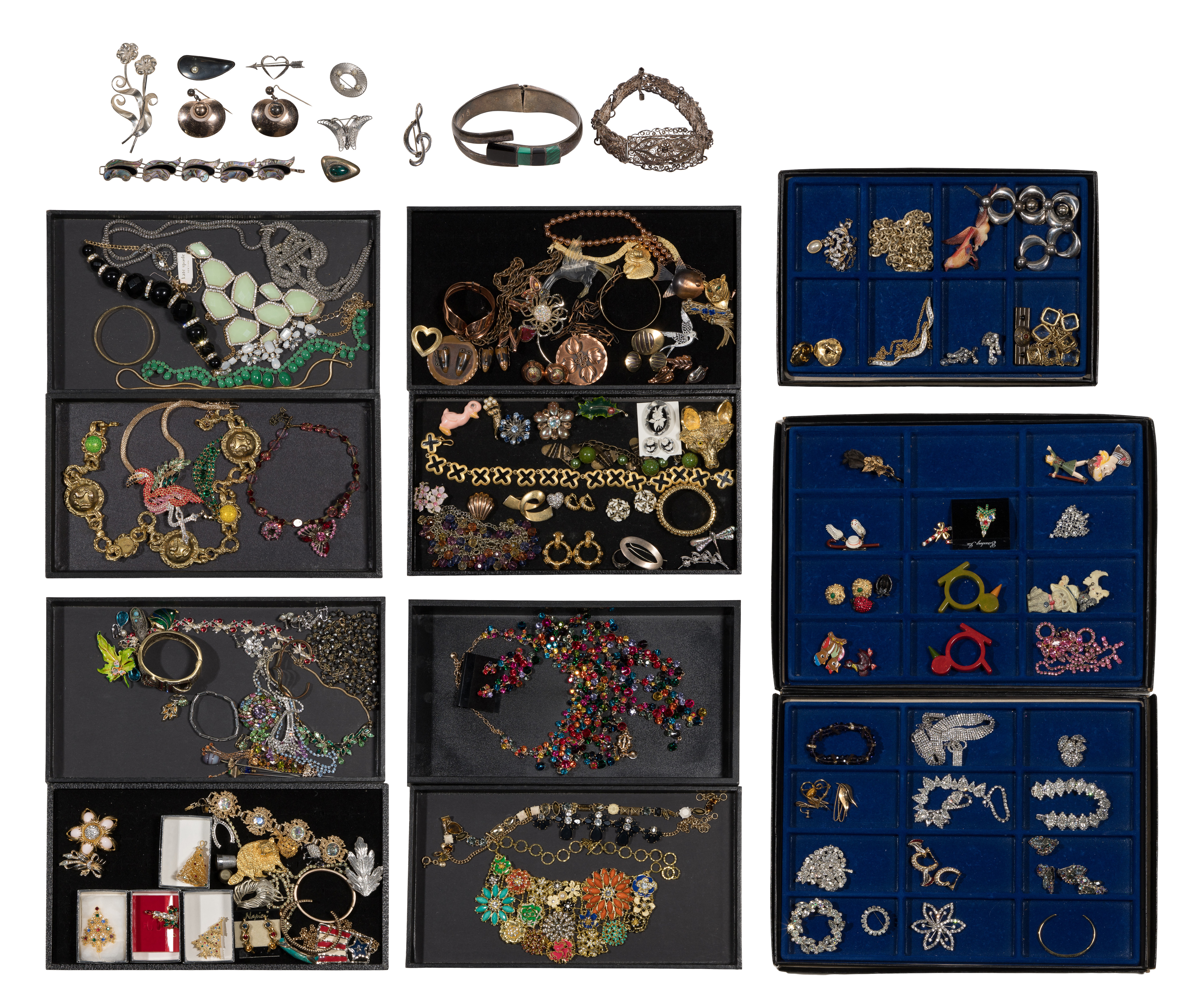 Including pins, bracelets, earrings (most marked ‘sterling’ / ‘925’) as well as approximately (19) pounds of necklaces, pendants, bracelets, pins and earring from makers such as Eisenburg, Wiess, Rebaje, Emanuel Ungaro, Renoir, Fred A. Block, Matisse Renoir, Napier and Kate Spade