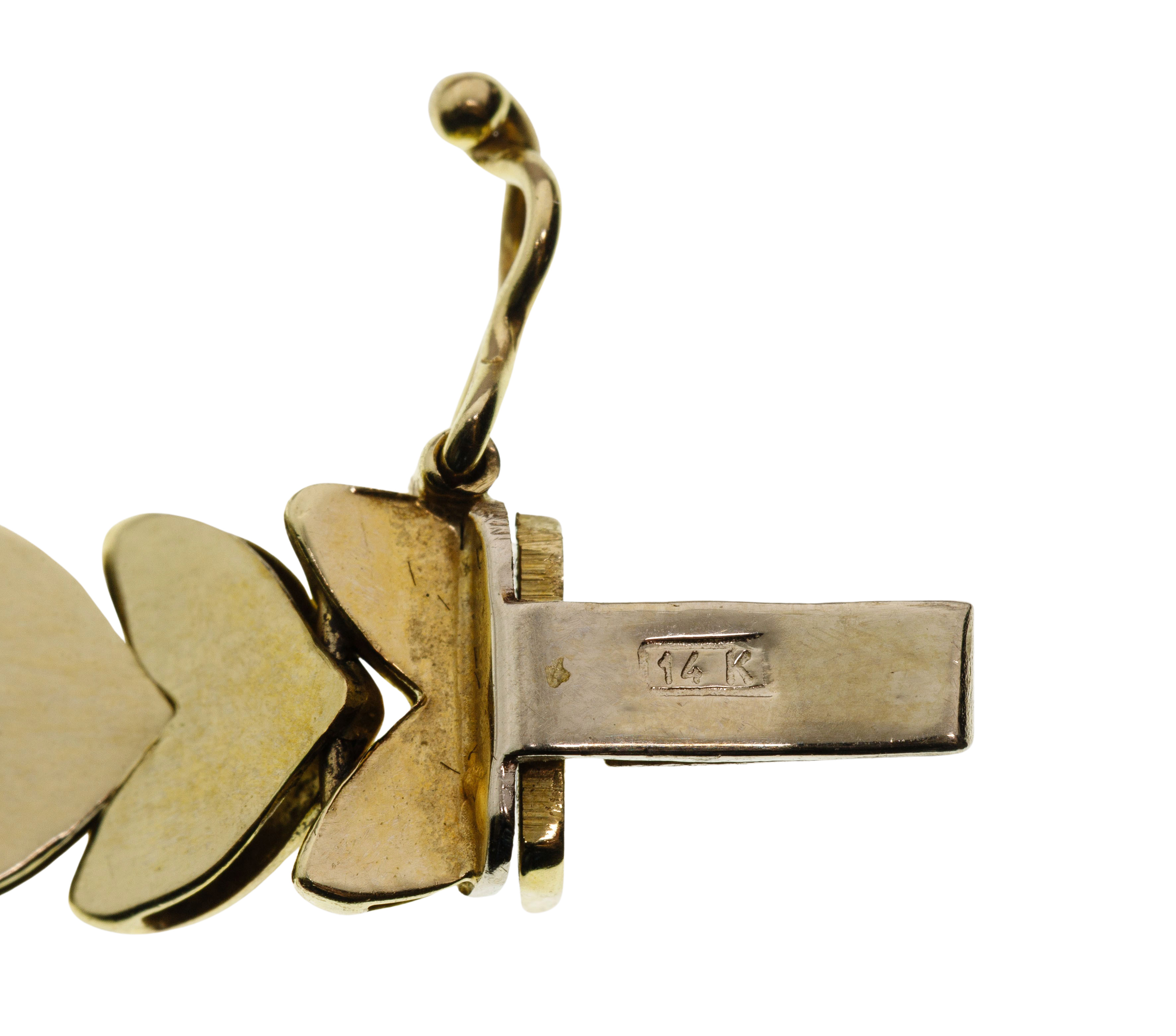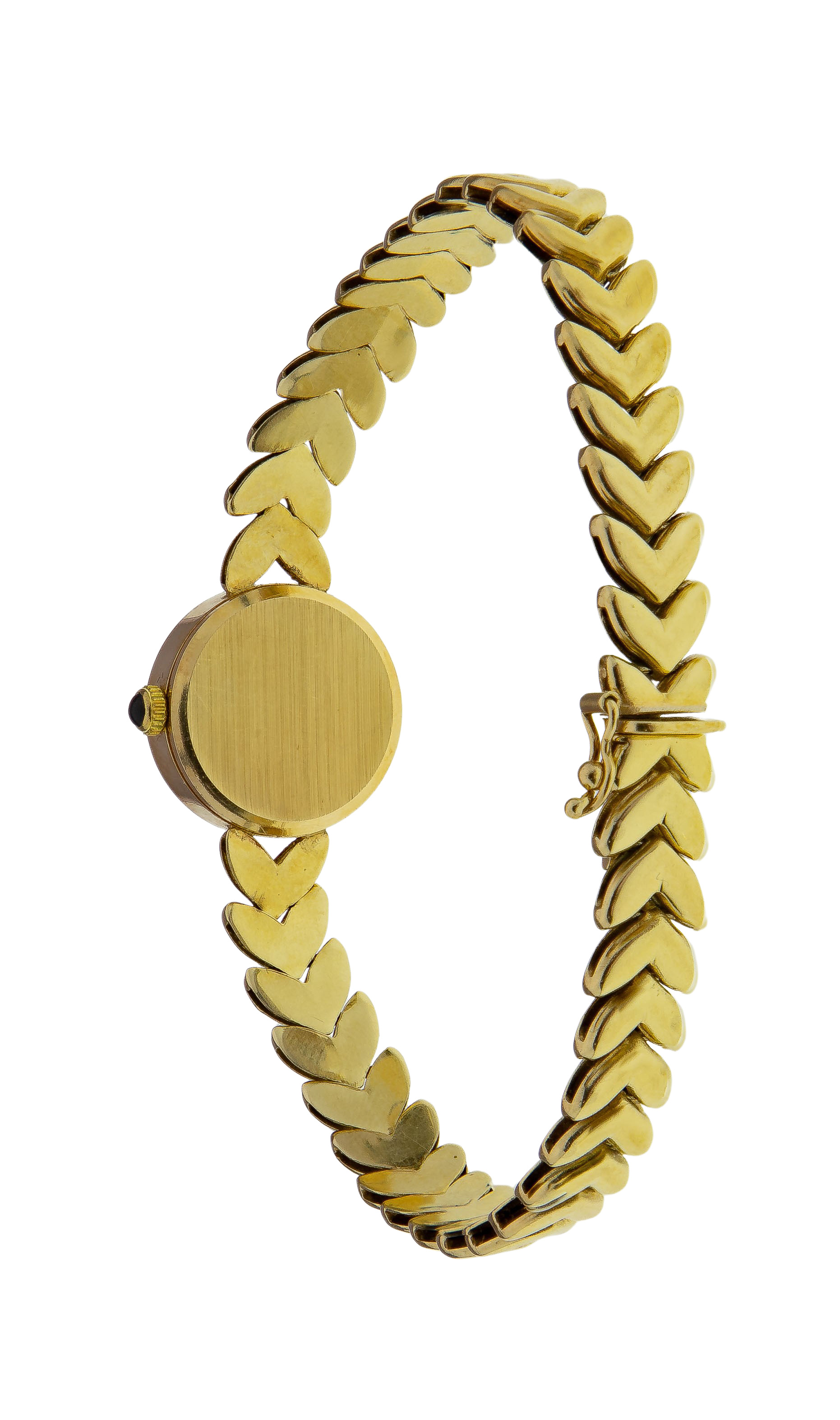 Having a round case and gold-tone dial, integrated heart-shaped link band (marked ’14k’)