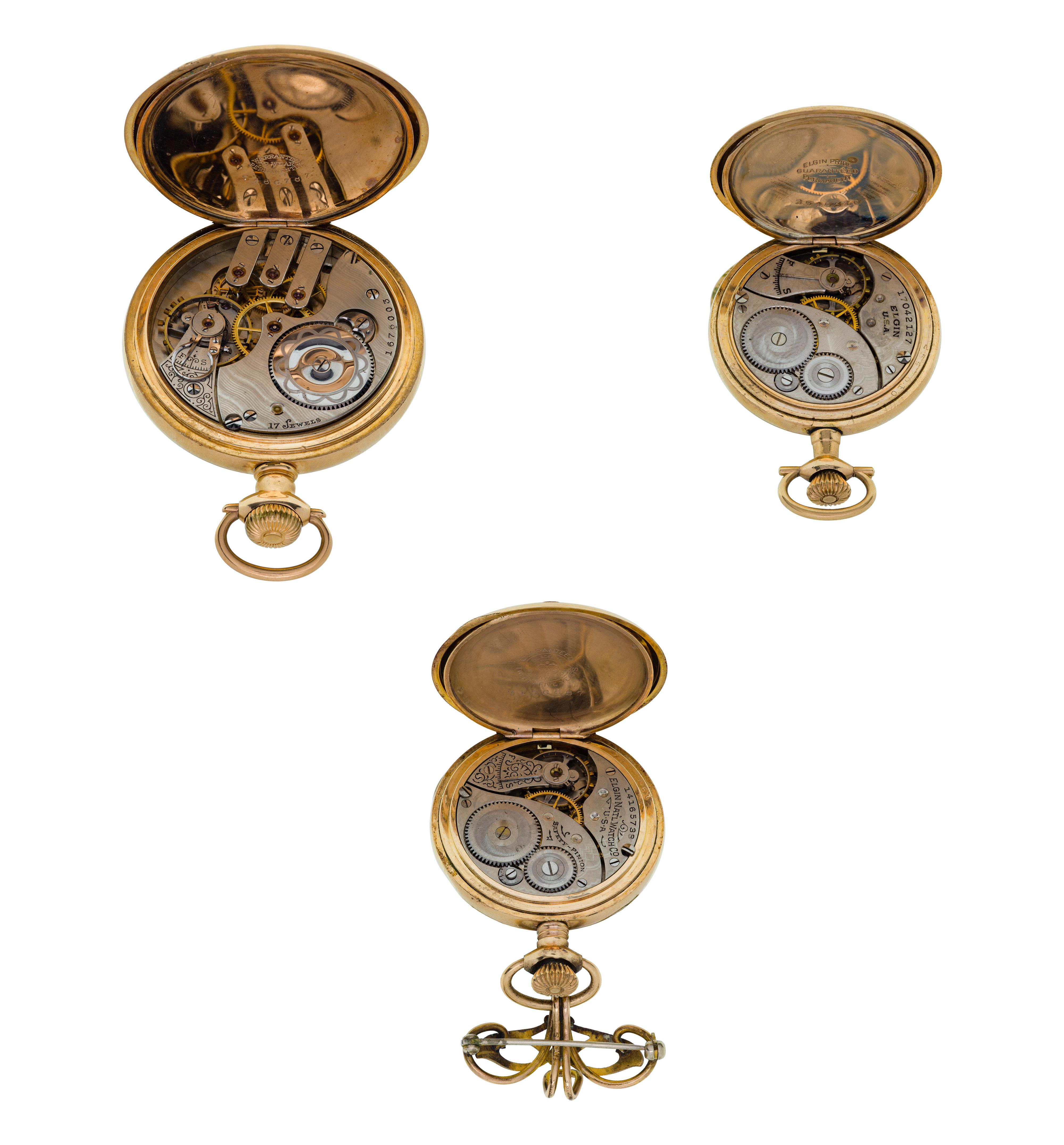 (3) items including an Elgin, c.1910, model 2, 7-jewel movement, 0s, grade 320, class 116, Roman numerals, thin spade hands, an Elgin, Arabic numbers, spade hands and a Plymouth Watch Co. (Illinois), 1903, model 5, #1676003, 17-jewel movement, 16s, class 184, Arabic numbers, moon hands