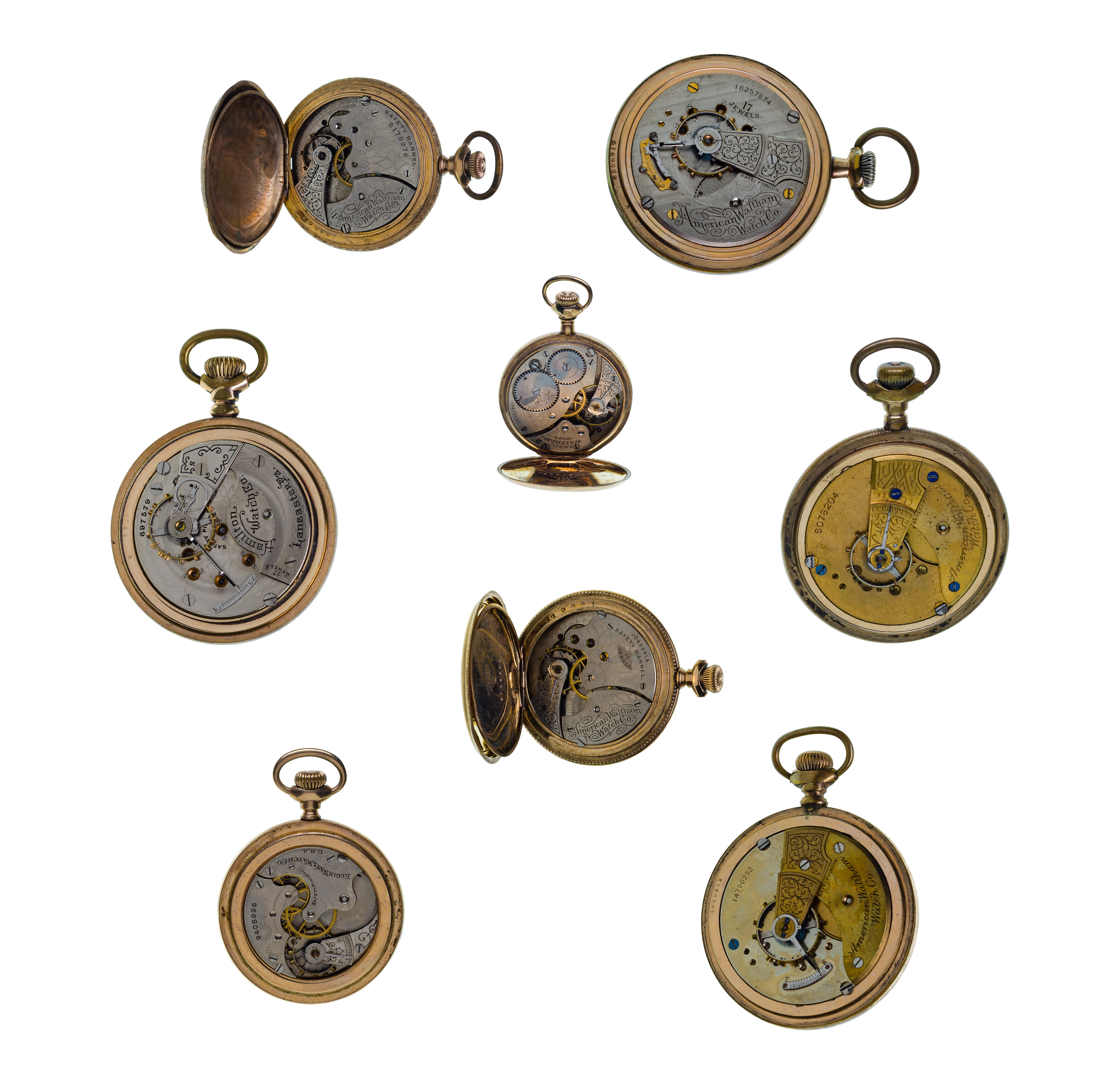 (8) items including an Elgin open face case movement #9408996 dating to 1902, size 6-0S, 206, 75, white dial having Arabic numerals, black hands, pendant wind, pendant set, a Waltham open face case movement #16257874 dating to 1907, 17-jewel movement, size 18S, 825, 83, white dial having Arabic numerals, blue hands, seconds sub-dial, pendant wind, lever set, a Waltham hunter case movement #10498814 dating to 1901, 15-jewel movement, size 6-0S, Seaside, 1890, white dial having Roman numerals, black hands, seconds sub-dial, pendant wind, pendant set, a Waltham hunter case movement #8178976 dating to 1897, size 6-0S, Seaside, 1890, white dial having Roman numerals, blue hands, seconds sub-dial, pendant wind, pendant set, a Waltham open face case movement #14750252 dating to 1906, size 18S, 1883, white dial having Arabic numerals, blue hands, seconds sub-dial, pendant wind, pendant set, a Waltham open face case movement #16961441 dating to 1908, size 0S, 110, 1900, white dial having Arabic numerals, black hands, seconds sub-dial, pendant wind, pendant set, a Waltham open face case movement #6078204 dating to 1893, size 18S, 1883, white dial having Arabic numerals, black hands, seconds sub-dial, pendant wind, pendant set and a Hamilton 697579 open face case movement #6977579 dating to 1911, 17-jewel movement, size 18S, 924, white dial having Arabic numerals, black hands, seconds sub-dial, pendant wind, lever set