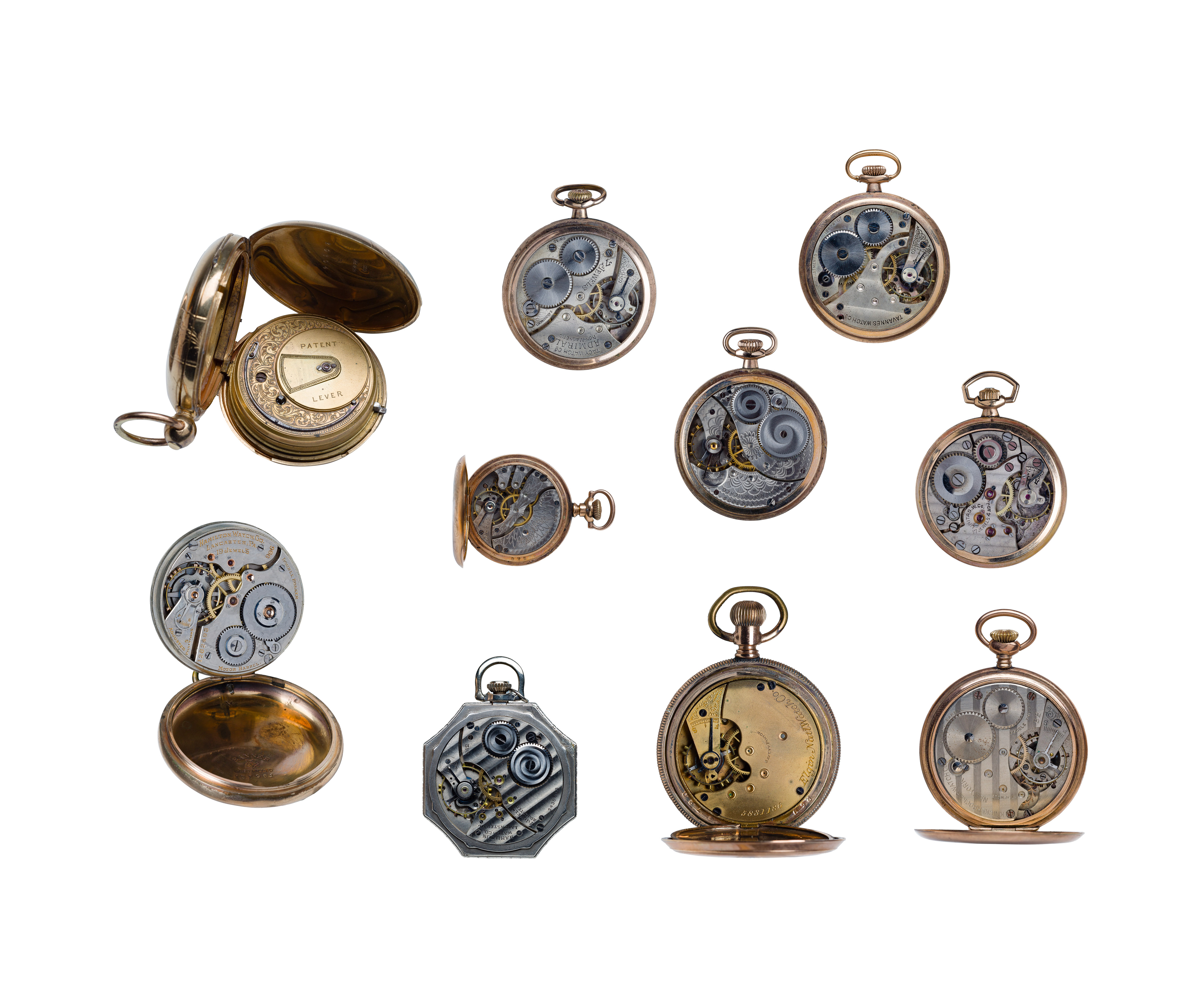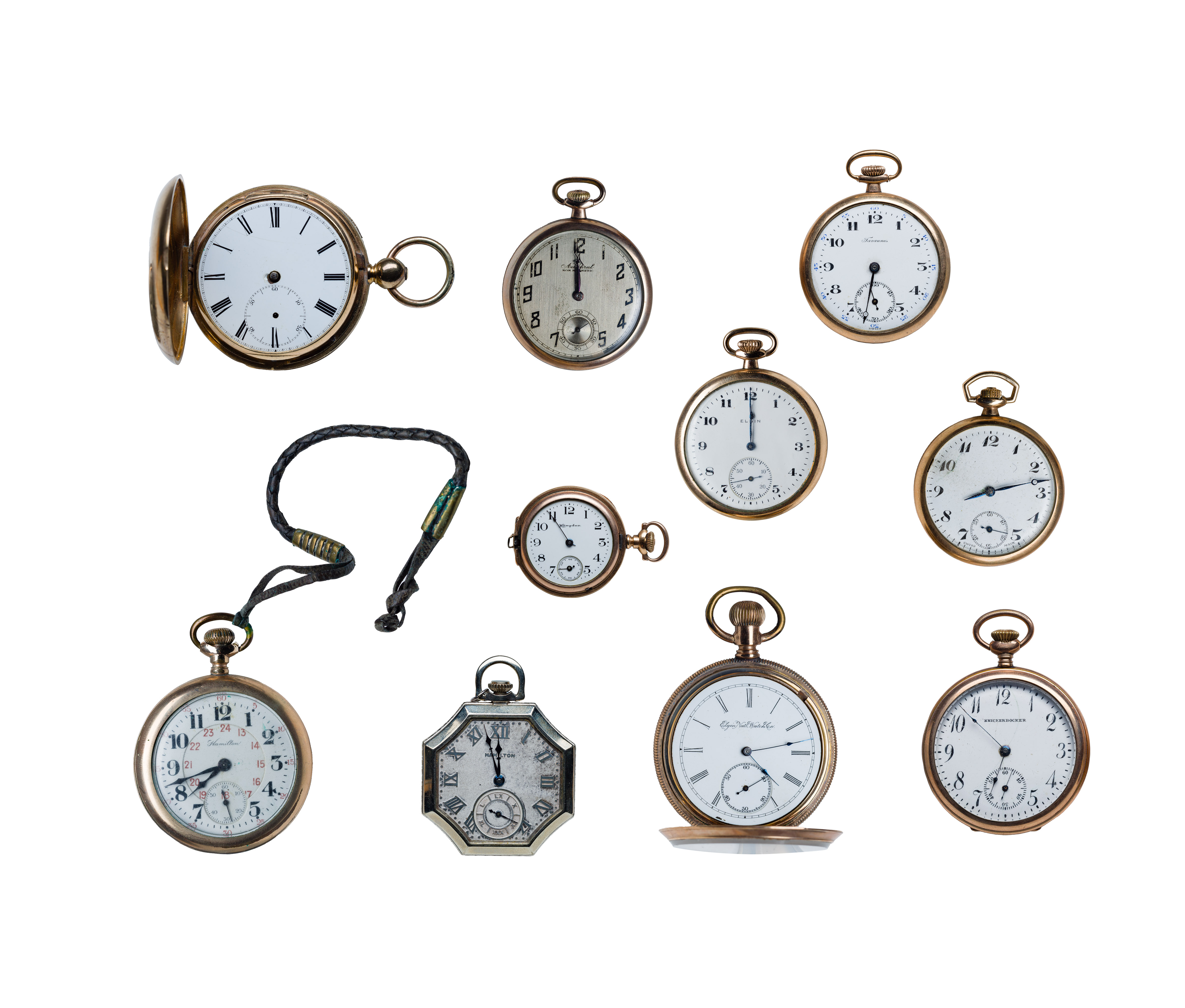 (10) items including Elgin open face hunter case, serial # 5831186, 7-jewels, c.1890, model 16s, grade 104, dial having Roman numerals, baton hands, subsidiary seconds dial and pendant wind, Elgin open face Wadsworth case, #20503009, 7-jewels, 1918, model 12s, grade 104, dial having Arabic numerals, baton hands, subsidiary seconds dial and pendant wind, Hamilton open hunter case, #131961, 17-jewels, 1900, size 18s, model 2, grade 912, dial having Roman numerals, spade hands, subsidiary seconds dial and a lever set, Hamilton octagon open case, #3438603, 17-jewels, 1936, model 12s, grade 104, dial having Arabic numerals, spade hands, subsidiary seconds dial and screw set, an unmarked hunter case, having the Jos. H. Anderson (London store) engraved on workings, key wind, enamel face and Roman numerals, a Tac Admiral open case, Swiss made, 7-jewels, c.1925, silver face, subsidiary seconds dial and spade hands, a Unitas Watch Co, Swiss made open face hunter case, manual wind, 17-jewels, Arabic numerals, subsidiary seconds dial and spade hands, a Hampden Molly Stark hunter case, #2228054, 7-jewels, 1908, model 4, 3/0s, dial having Arabic numerals, baton hands and lever set, a Knickerbocker open face hunter case, 7-jewels, enamel face, Arabic numerals, subsidiary seconds dial and a Tavannes open face case #12624107, 7-jewels, enamel face Arabic numerals, subsidiary seconds dial and breguet hands