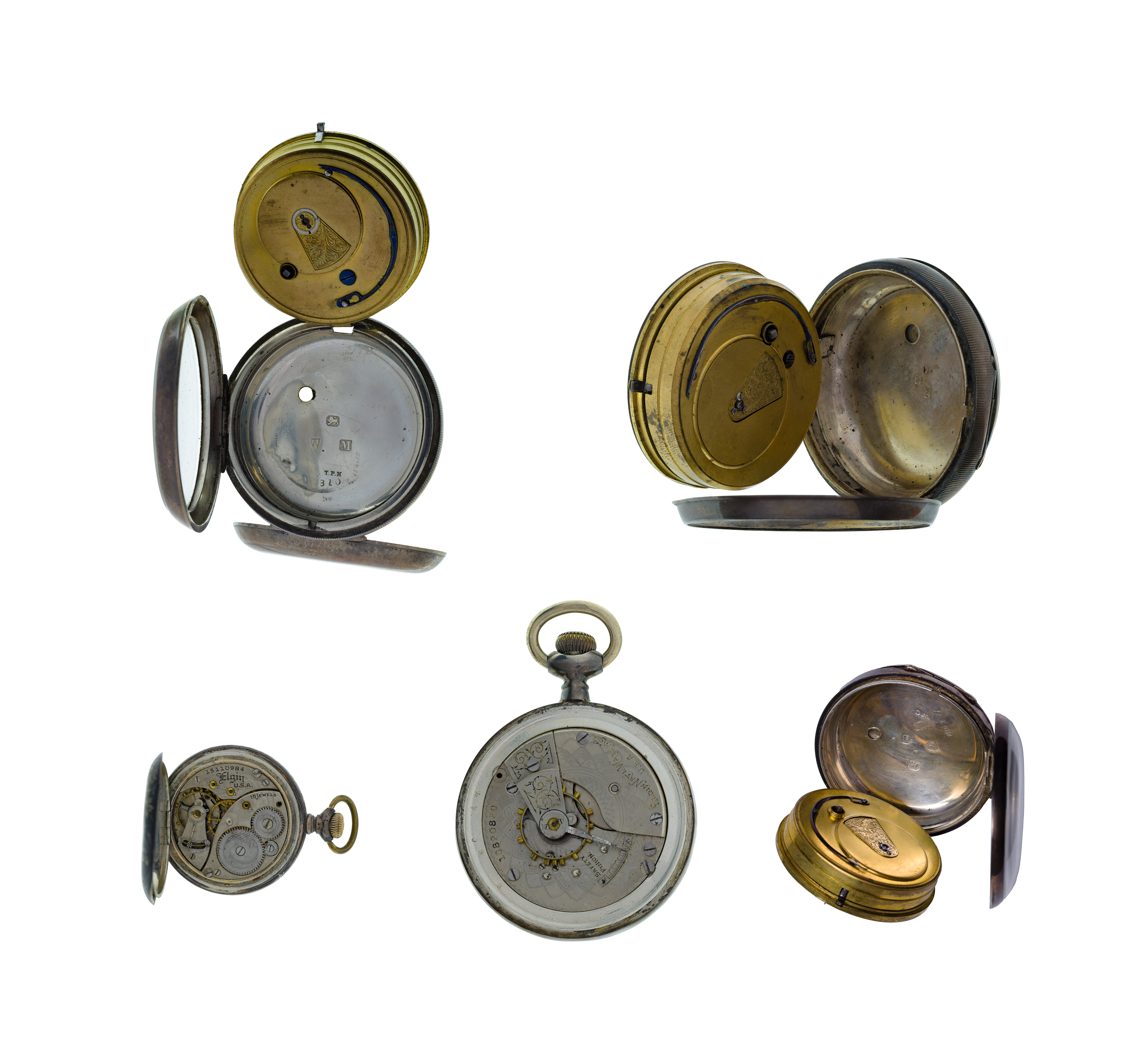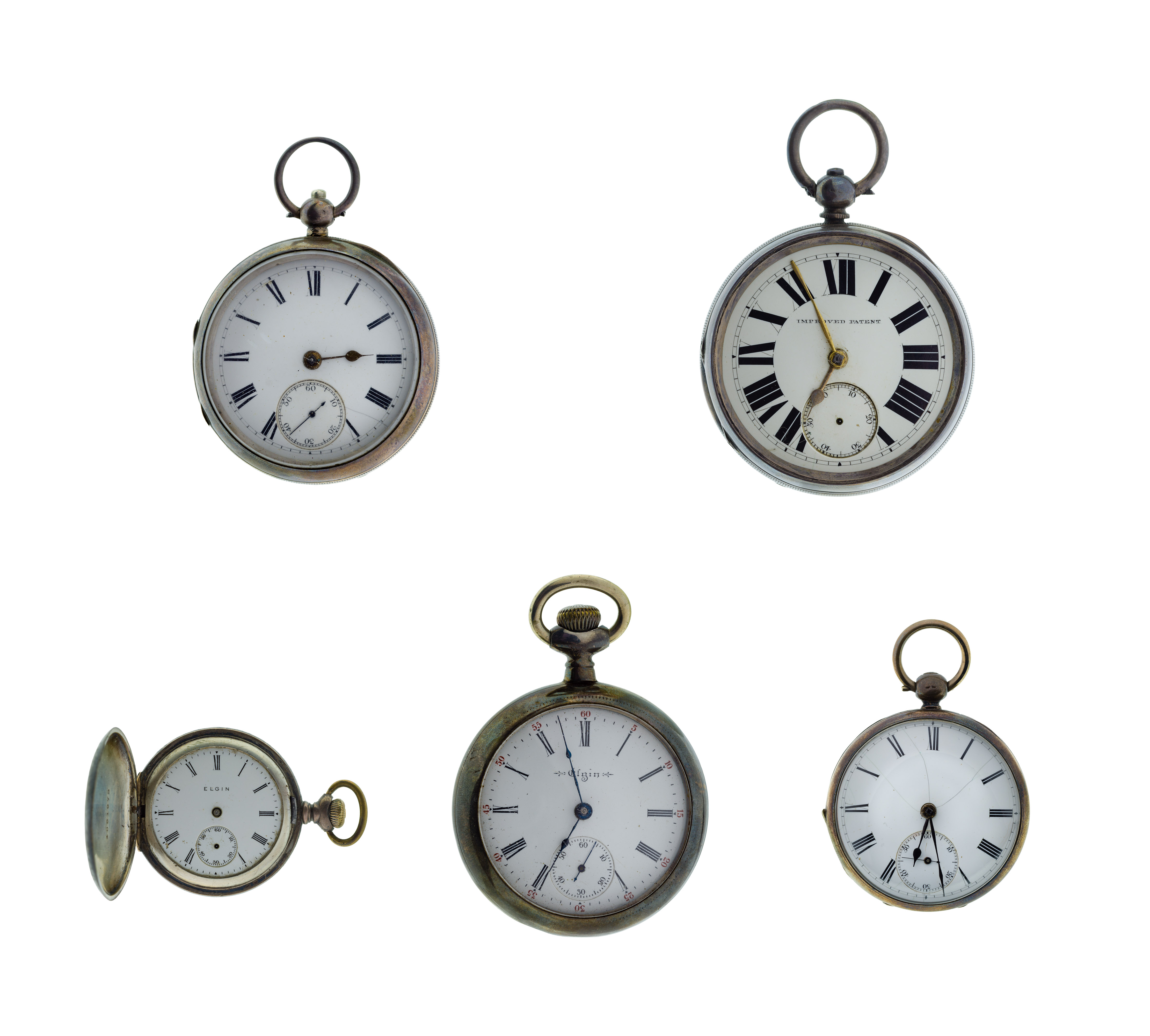 (5) items including an Elgin hunter case movement #15110984 dating to 1911, 15-jewel movement, size 0S, 354, 116, white dial having Roman numerals, seconds sub-dial, pendant wind, pendant set, a Hampden open face movement #29834 dating to 1877, size 18S, white dial having Roman numerals, gold-tone hands, seconds sub-dial, key wind, key set, an unknown maker open face case movement #80069, white dial having Roman numerals, black hands, seconds sub-dial, key wind, key set, a Milne open face case movement #4699 dating to c.1830, size 14S, white dial having Roman numerals, black hands, key wind, key set and an Elgin open face case movement #10820820 dating to 1905, size 18S, 288, white dial having Roman numerals, black hands, seconds sub-dial, pendant wind, pendant set (all marked ‘sterling’ / ‘925’ / lion passant)