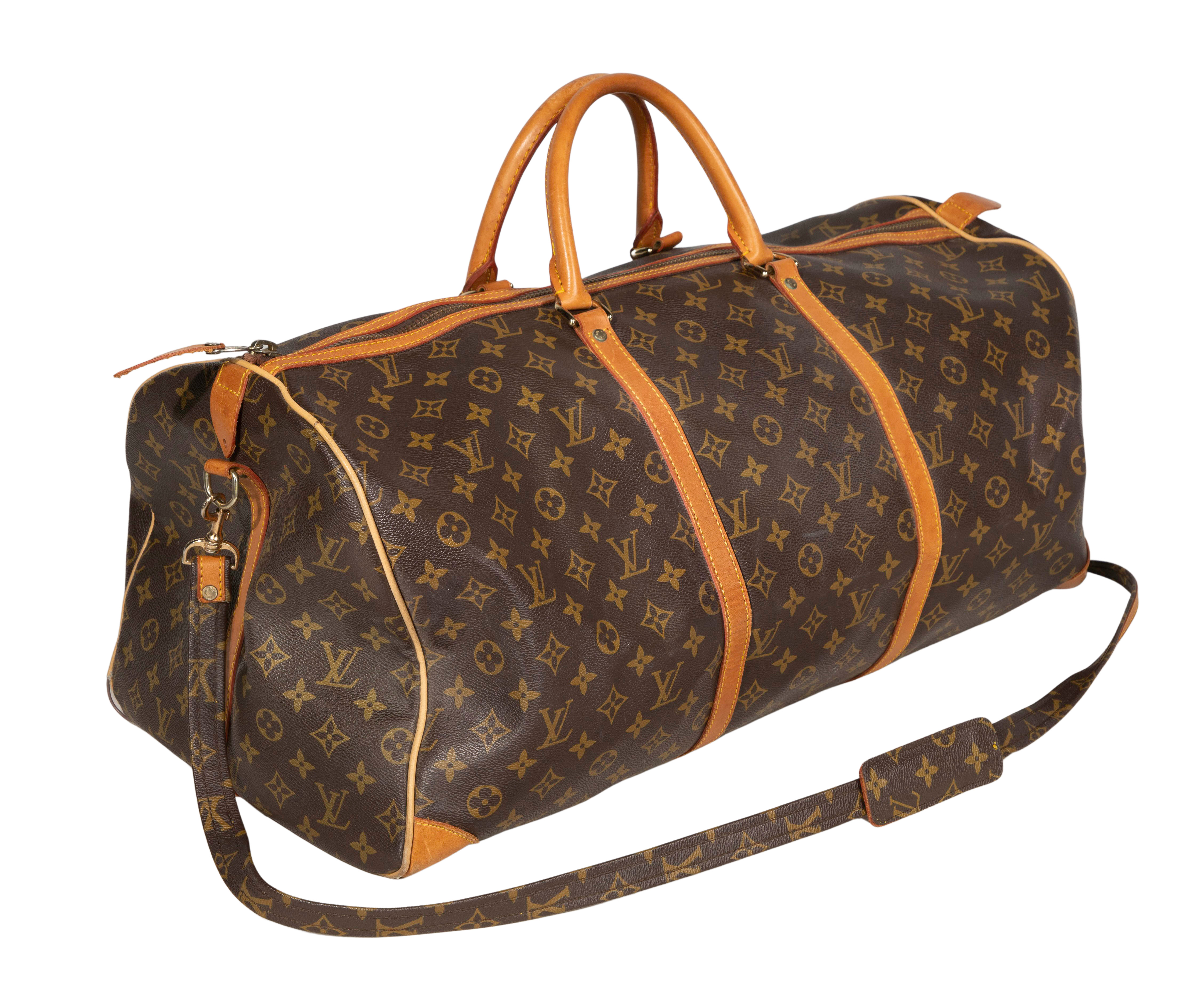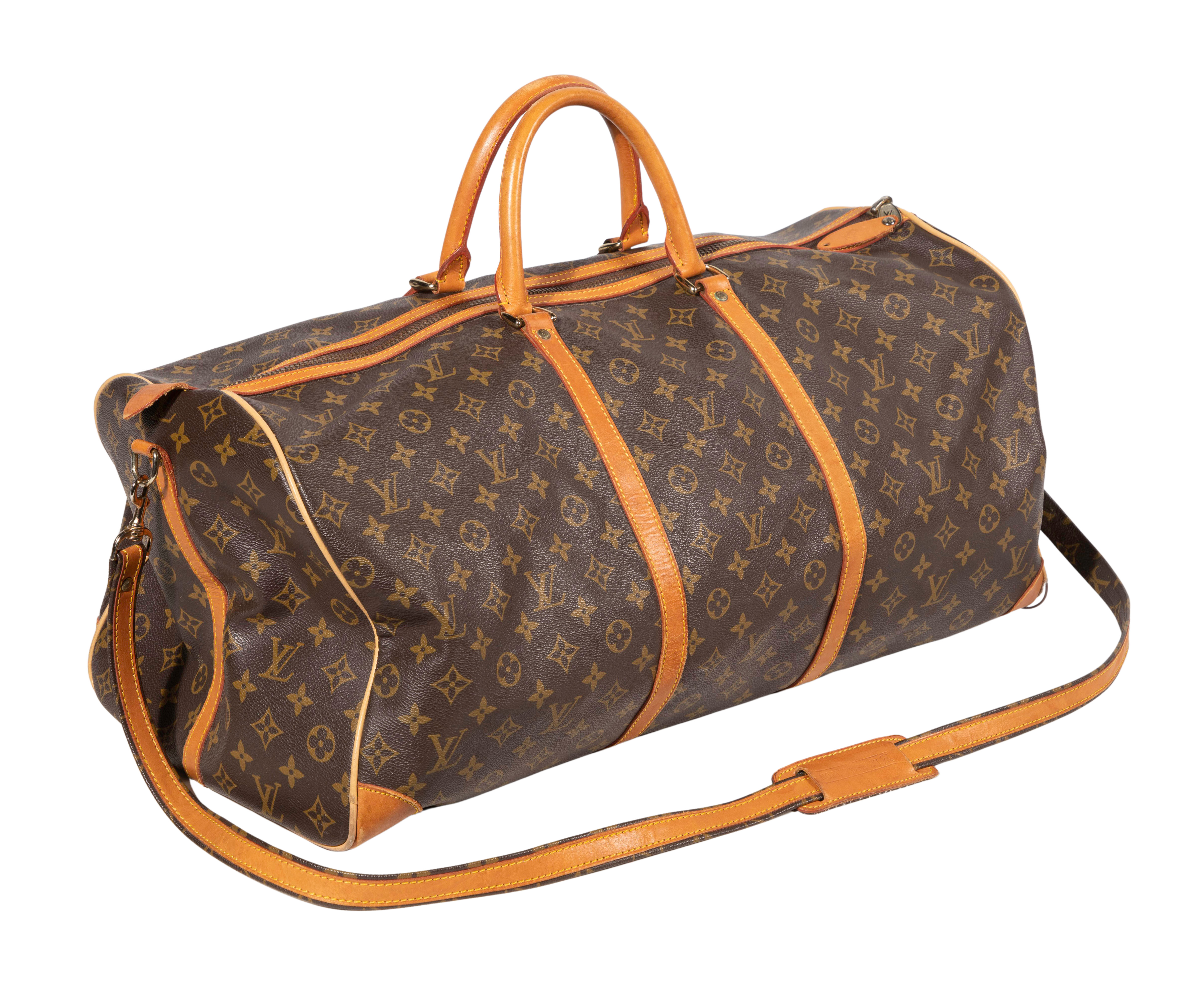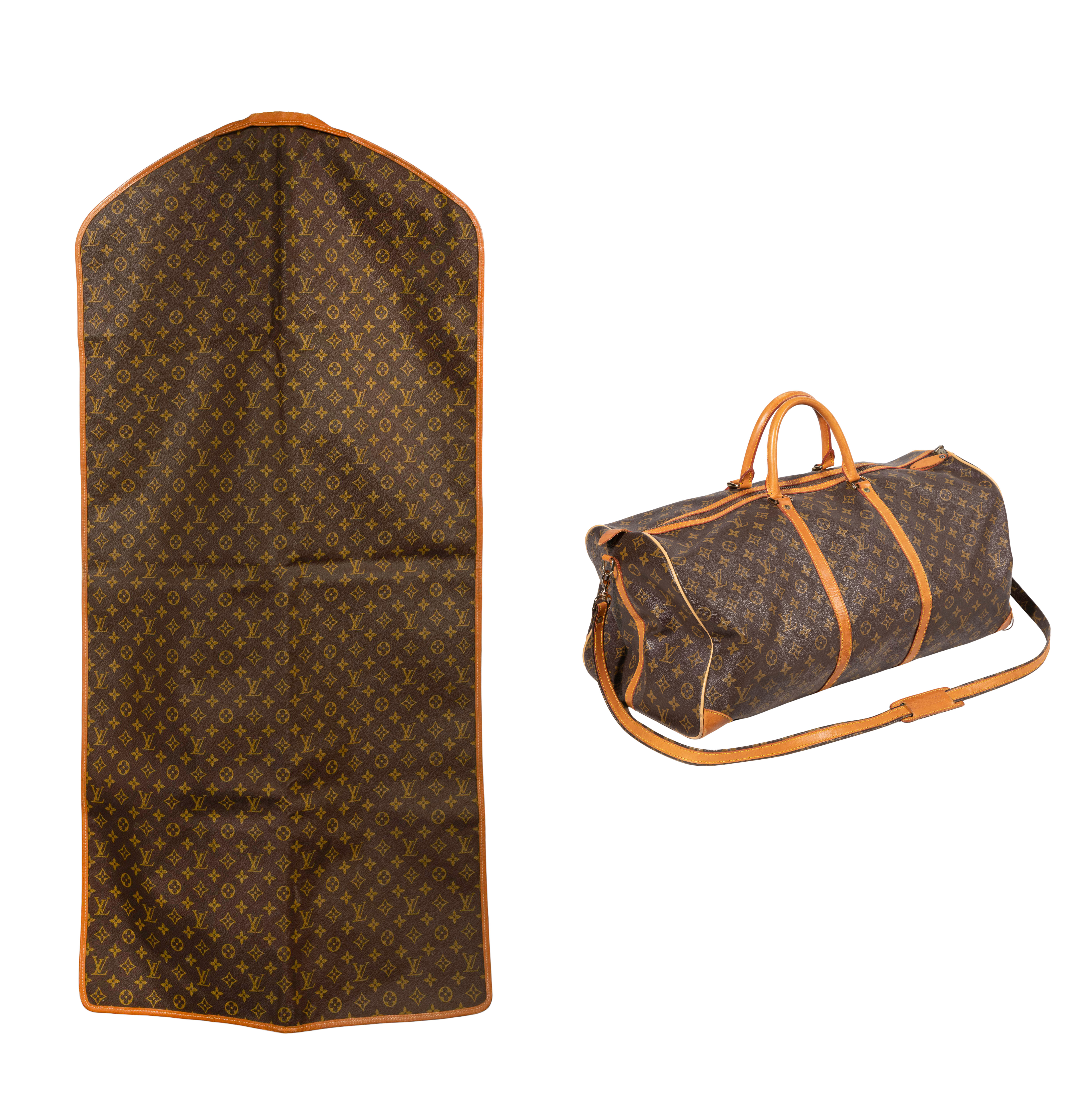 (2) monogrammed items including a Keepall Bandouliere model #55 duffel bag having shoulder strap and a garment bag