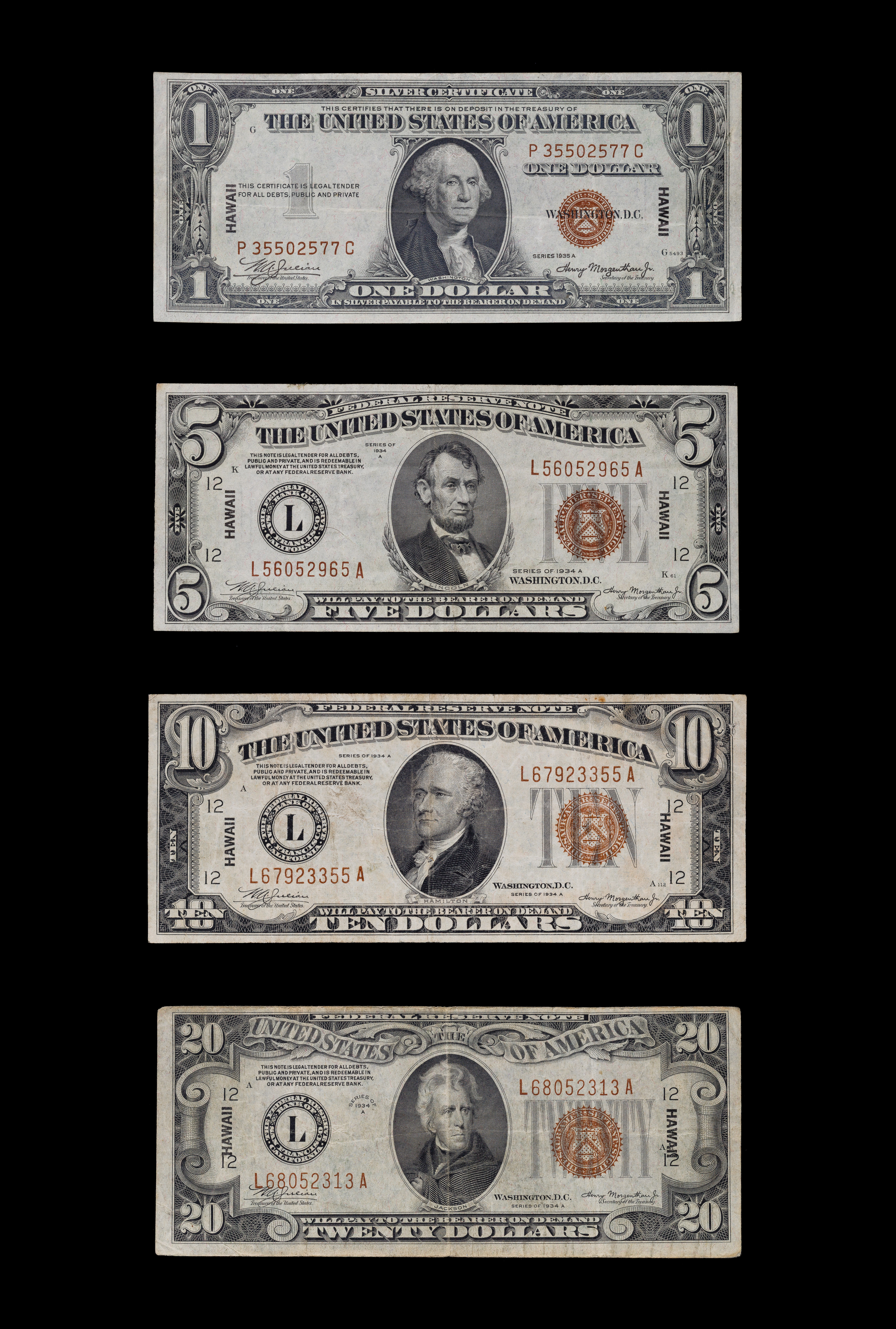 (4) items stamped ‘Hawaii’ having red seals including a 1935-A $1 P35502577C, a 1934-A $5 L56052965A, a 1934-A $10 L67923355A and a 1934-A $20 L68052313A