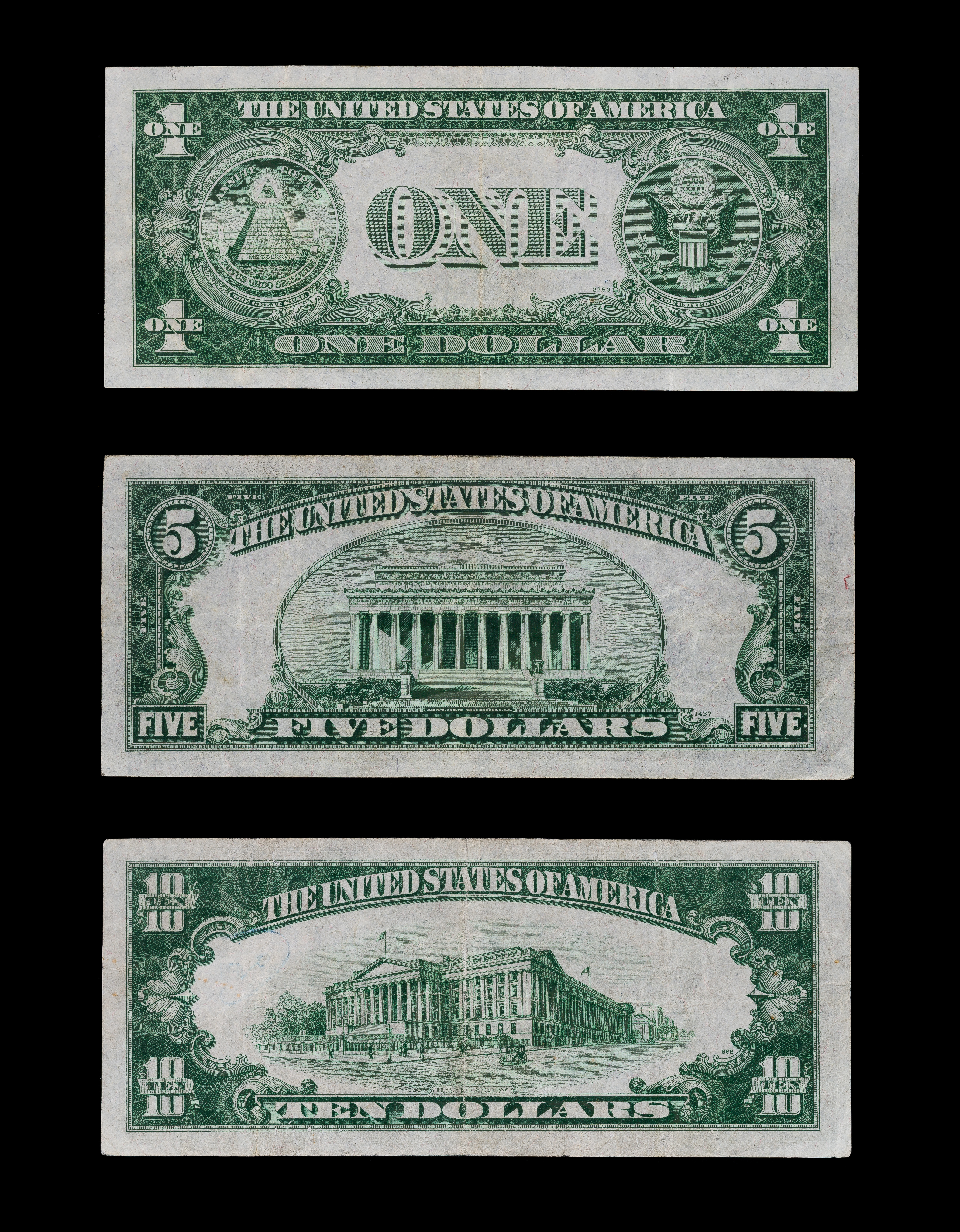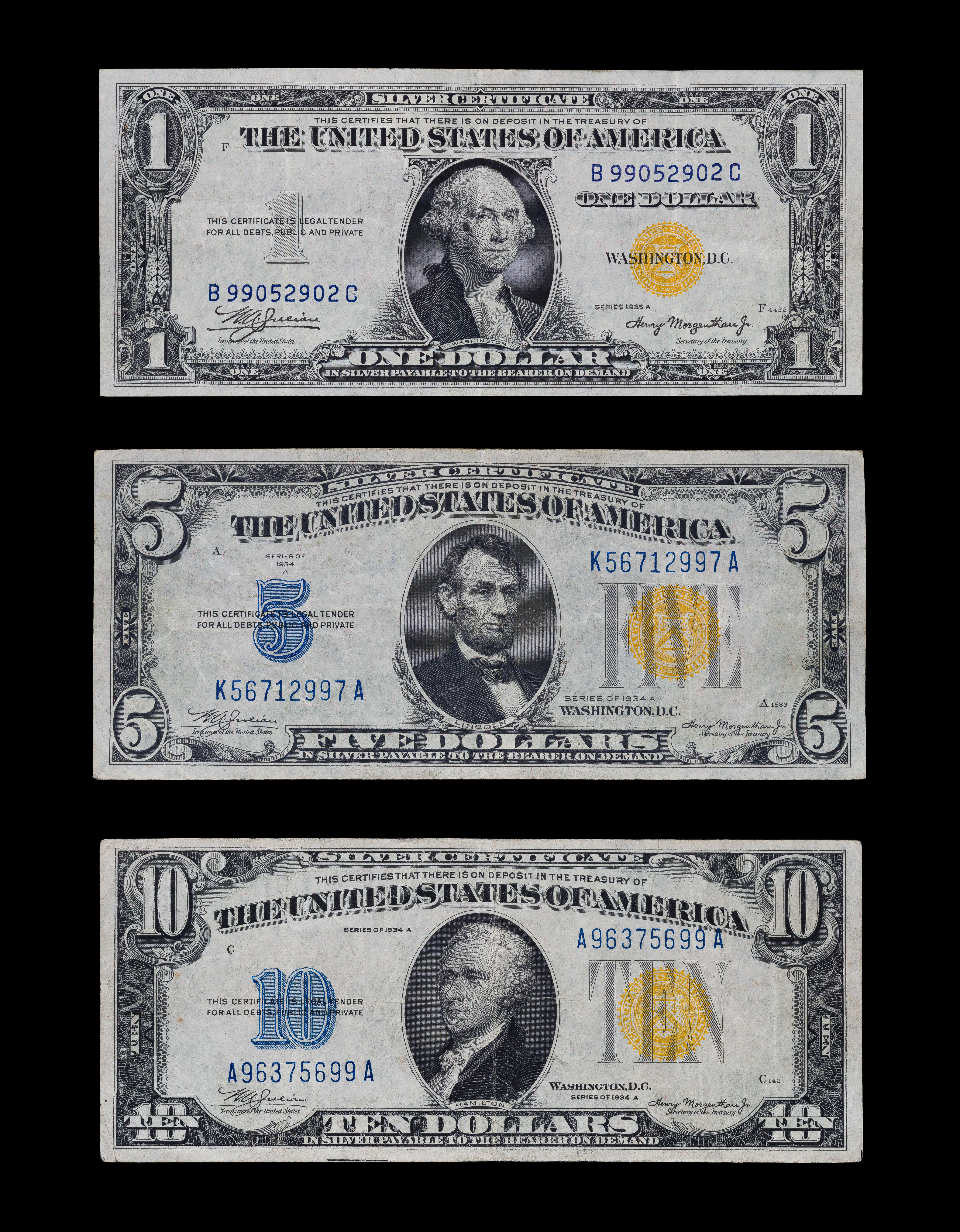 (3) items including a 1935-A $1 B99052902C, a 1934-A $5 K56712997A and a 1934-A $10 A96375699A