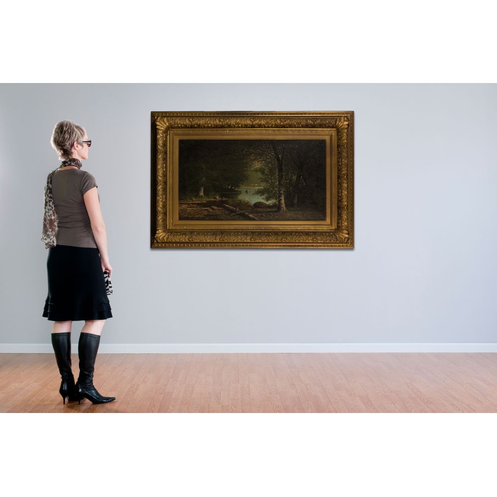 1863, signed and dated lower right, depicting trees surrounding water, in a gilt carved gesso on wood frame
