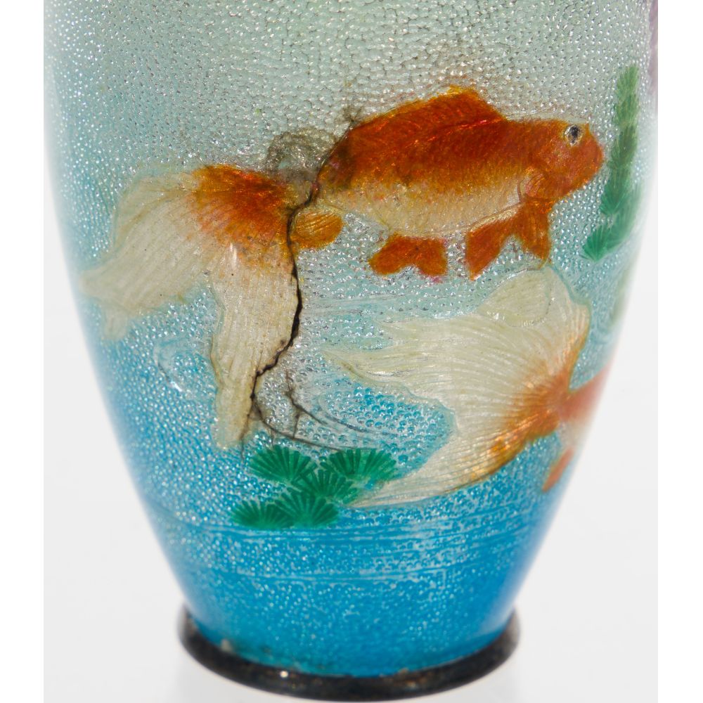 (6) total items including (4) small vases by Kawaguchi Bunzaemon and a vase by Kumeno Teitaro, all having a fish or floral motif; together with a brass cloisonne vase