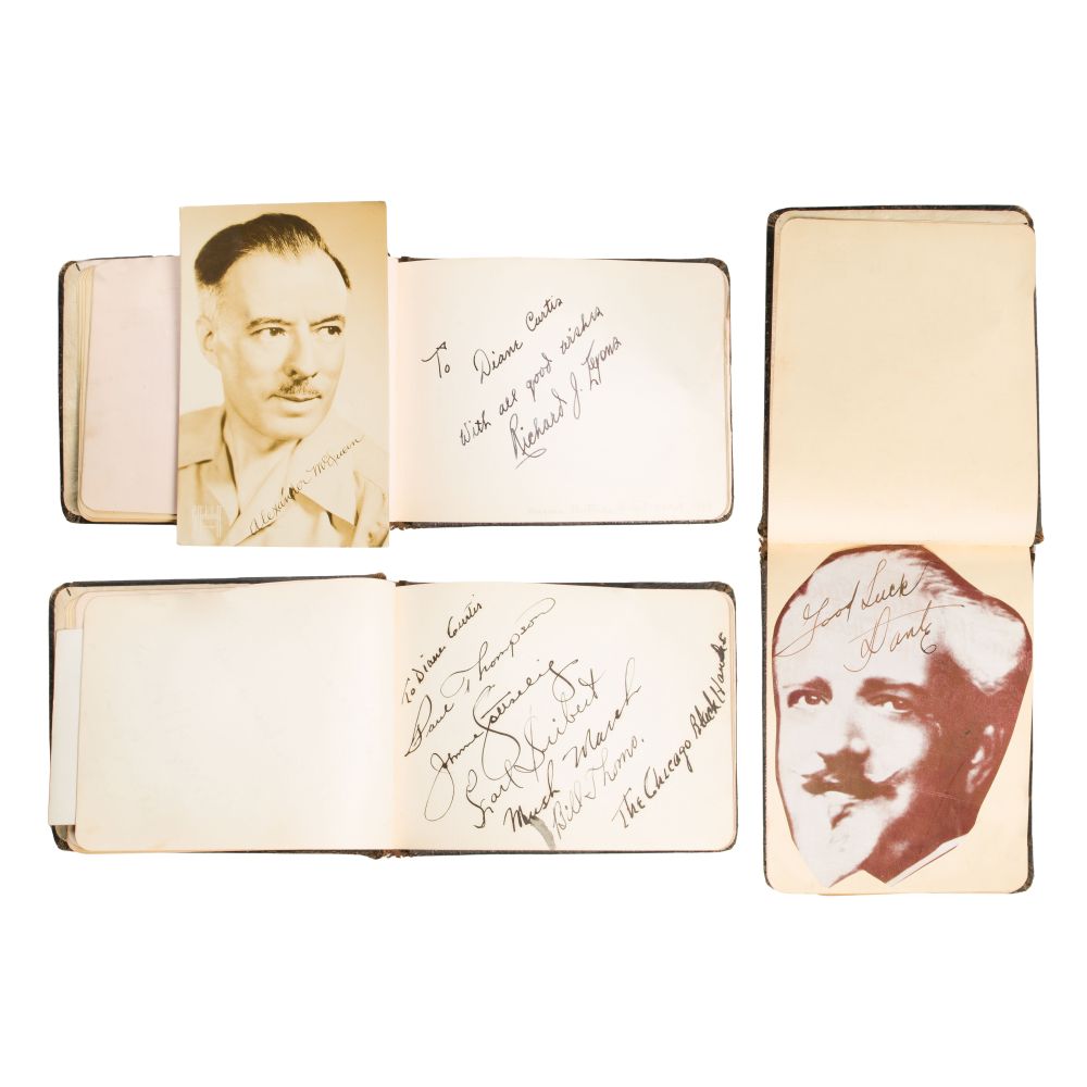 A late 1930s to 1940s album containing signatures and inscriptions from Illinois politicians, some entertainers including Bud Abbot, five Chicago Blackhawks players and a signed photo of radio personality Alexander McQueen laid in; together with Columbian Exposition “Chicago Day” and “Manhattan Day” ticket stubs in a suede pouch