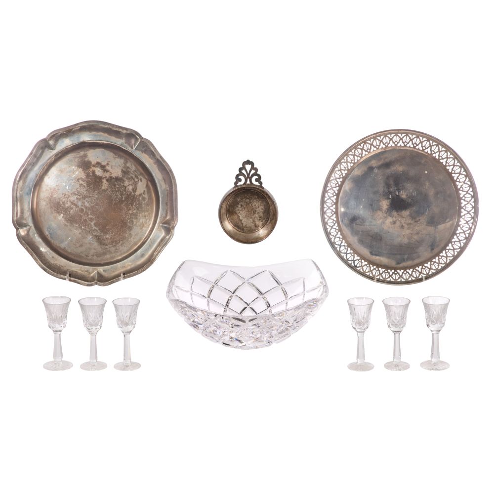(10) items including a pierced tray (marked “sterling” / “925”) and a diamond cut crystal bowl (both marked “Tiffany &Co.”), a set of Waterford (6) Lismore cordials (etch marked), a tray and a porringer (both marked “sterling”)