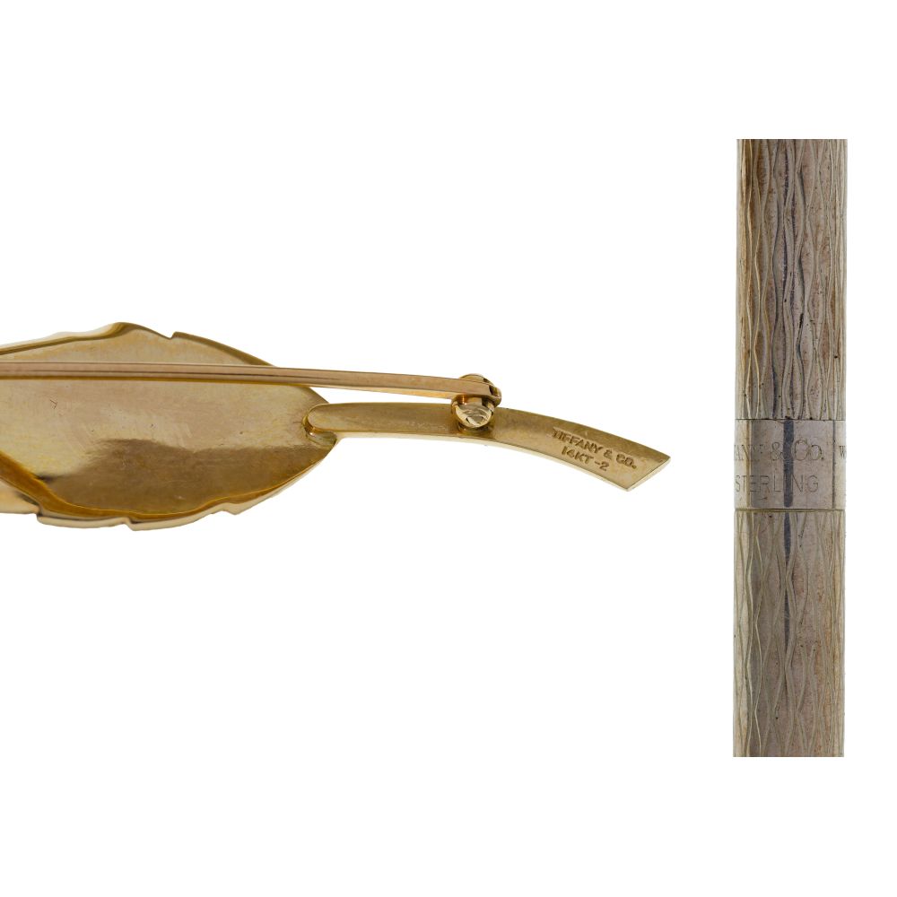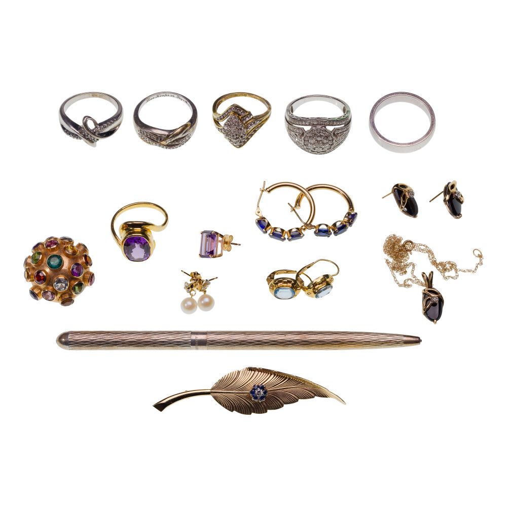 (15) items including an amethyst ring and a multi-color gemstone dome clip style single earring (unmarked 18k), (3) pairs of pierced earrings, a single earring, a black onyx pendant on necklace and matching pair of earrings, a Tiffany & Co. leaf pin having a diamond and sapphire center setting (marked “14k”), a Tiffany & Co. pen and (5) rings with some having diamonds (marked “925 / “sterling / “950”)