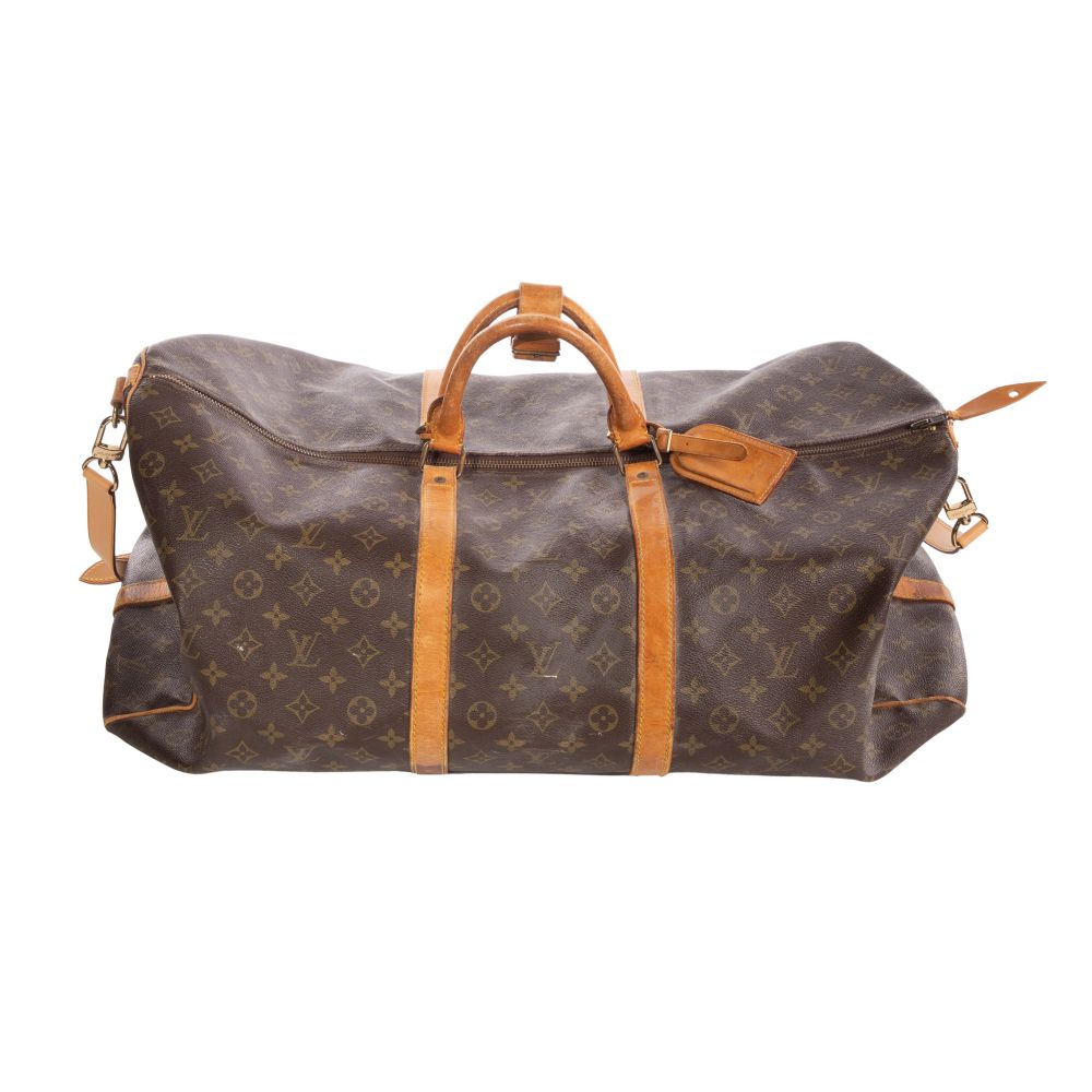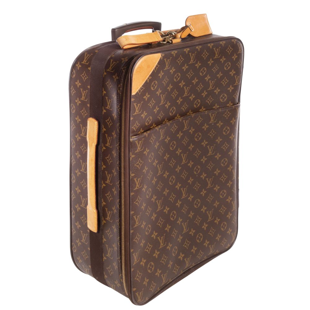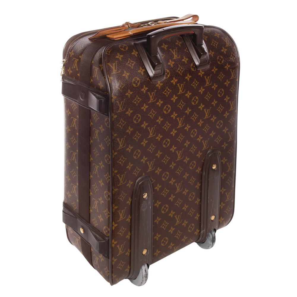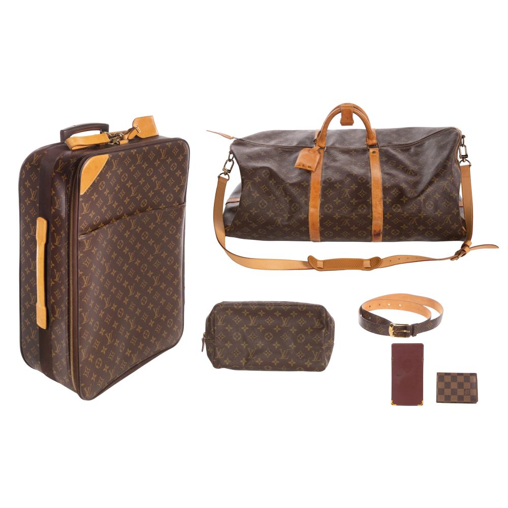 (4) items including the Pegase 55 rolling suitcase having a monogram canvas exterior, natural cowhide leather trim, reinforced corners, a telescopic handle, a top carry handle, protective feet, a front zippered pocket, the interior having elastic luggage straps, fabric lining and suit bag, including a dust bag, a Keepall 60 having a monogram canvas exterior, natural cowhide leather handles, shoulder strap and trim, a double zip closure with gold-tone hardware and a textile-lined interior as well as a DOP kit and a belt (size 44)