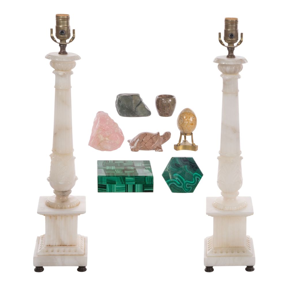 (9) items including a pair of carved alabaster table lamps in a Corinthian column design on a stepped square base, a malachite cigarette box and coaster, a stone egg on stand, a marble turtle, a rose quartz fragment, a green rock fragment and a trinket vessel