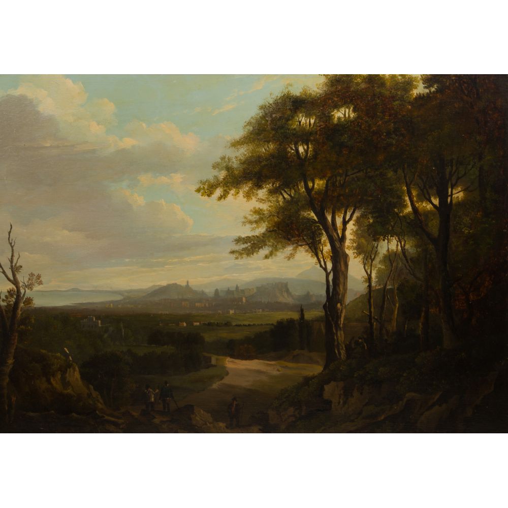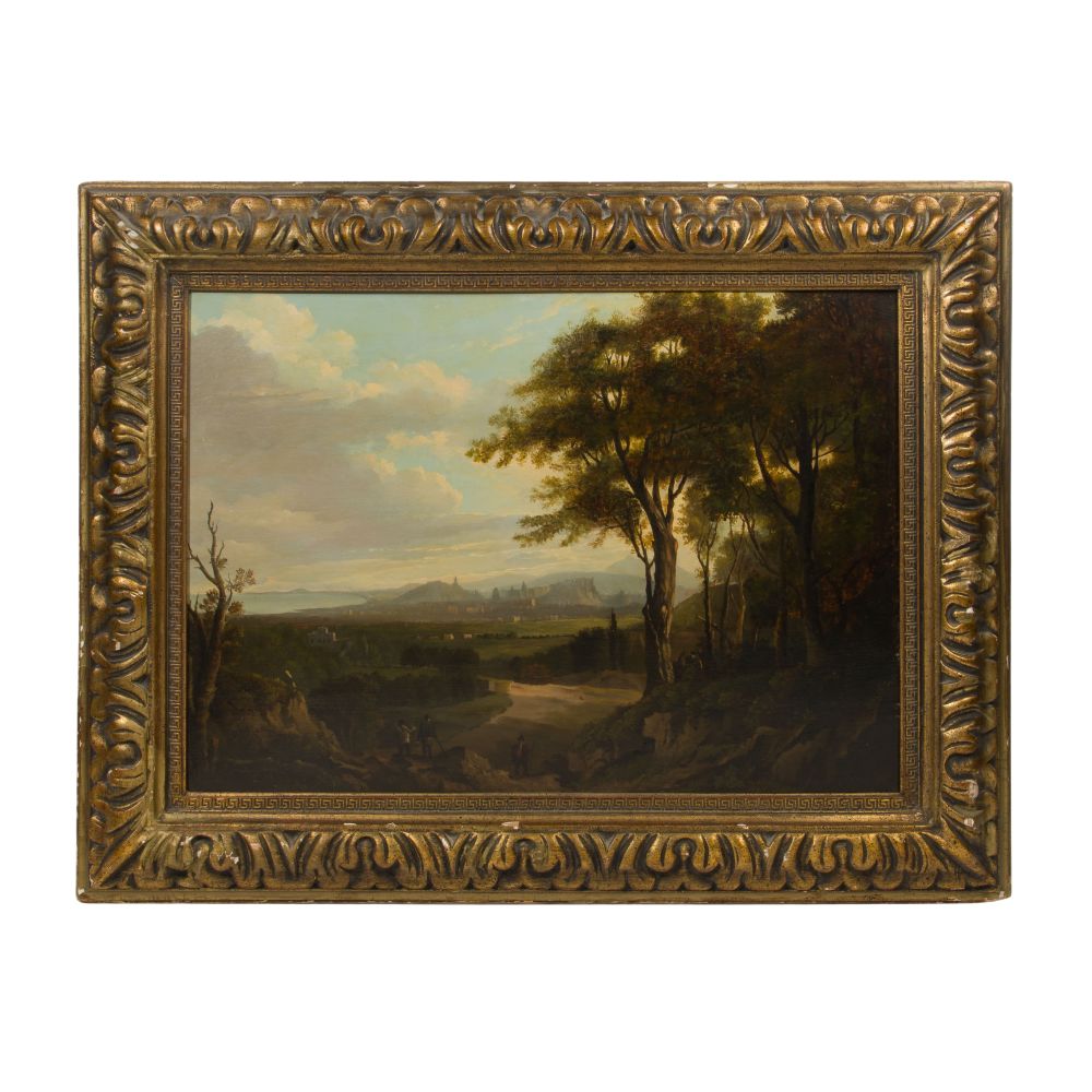 Undated, indistinctly signed lower right, depicting hikers emerging from wooded high ground into a vista including a town on a body of water, in a gold-tone gesso on carved wood frame
