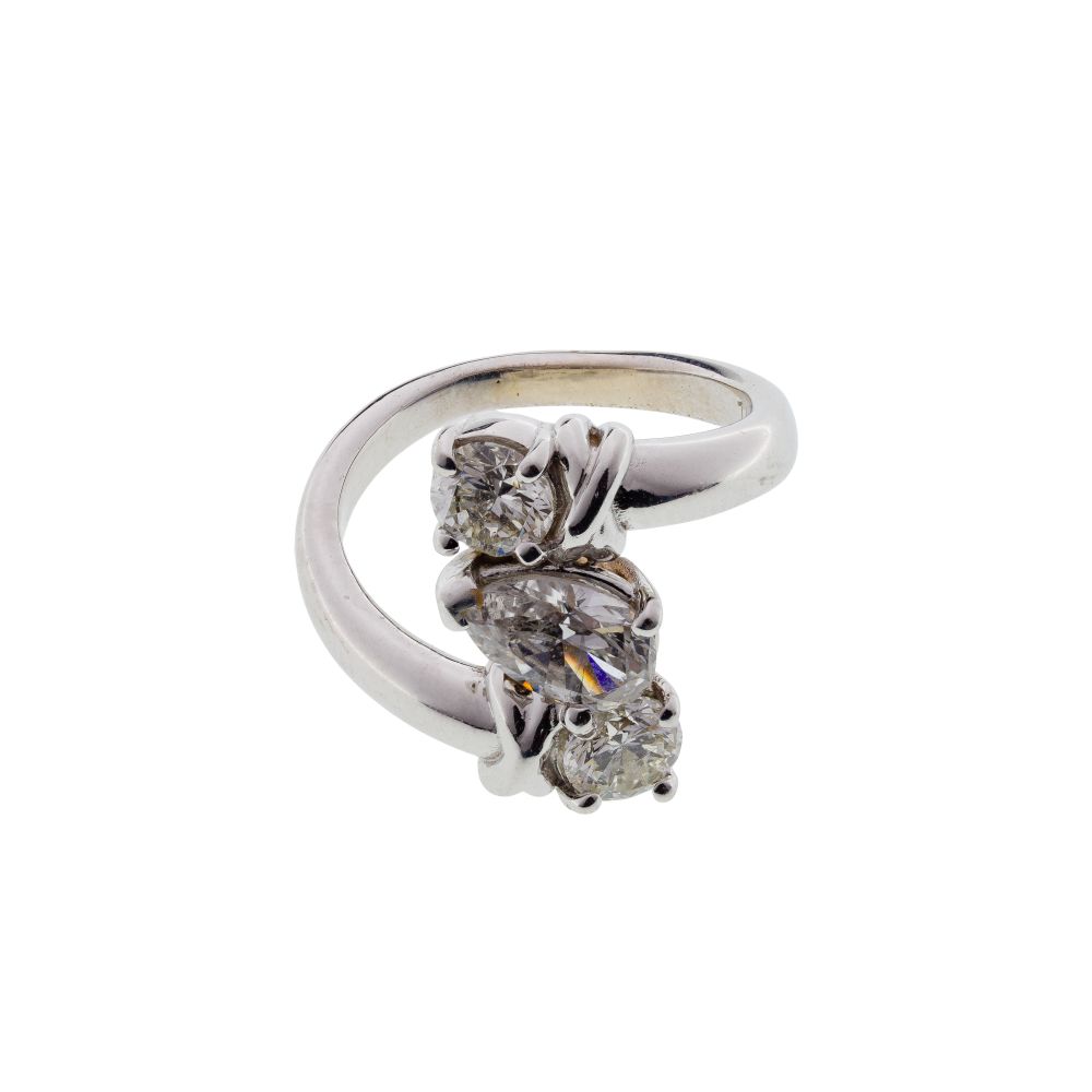Having a center pear cut diamond weighing approximately 0.96 carat, J/K color, I-1 clarity, flanked on both end by round cut diamonds weighing approximately 0.49 and 0.36 carat, K/L color, SI-2 clarity, (marked “14k”), having box