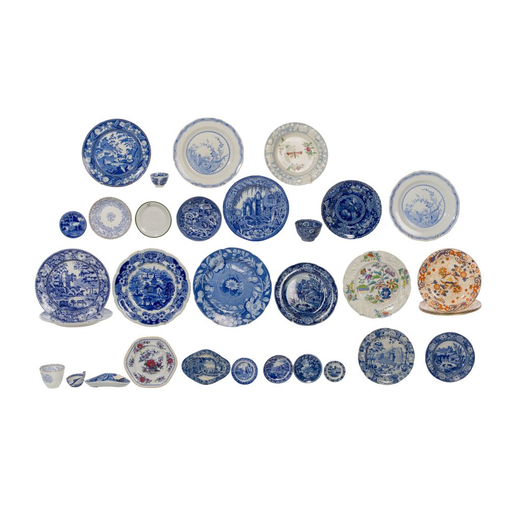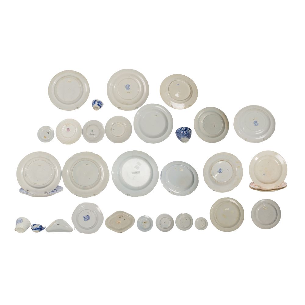 (31) items, mostly blue and white transfer decorated, but including multi-color enameled items, some having marks underside, some having alphanumeric collector labels underside