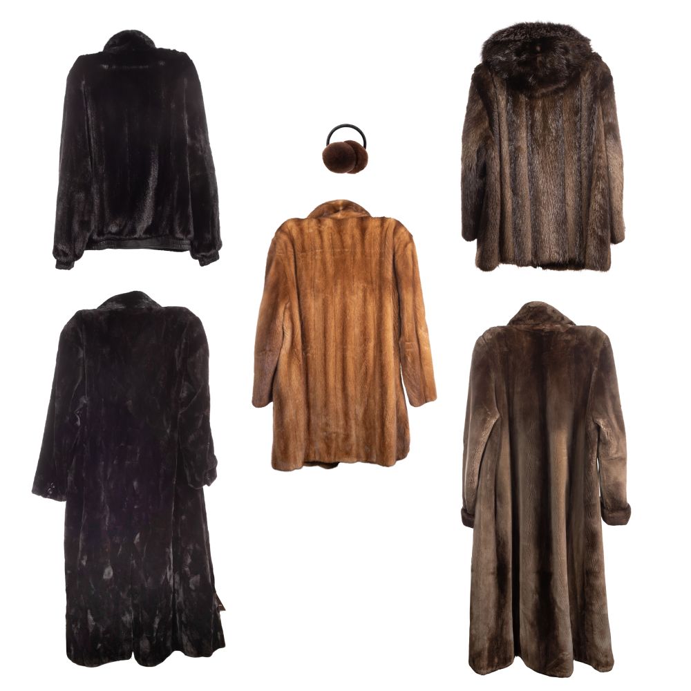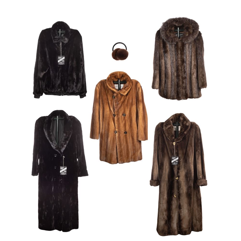 (6) items including a full length nutria coat, a bomber style reversible black mink and leather jacket, a brown mink car coat, a hooded raccoon jacket, a black sheared mink double breasted coat and a pair earmuffs, all retaining their storage / cleaning tags from York Furriers