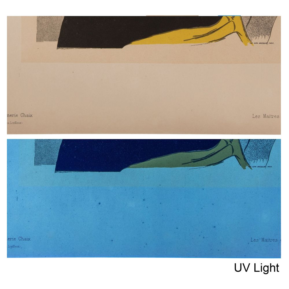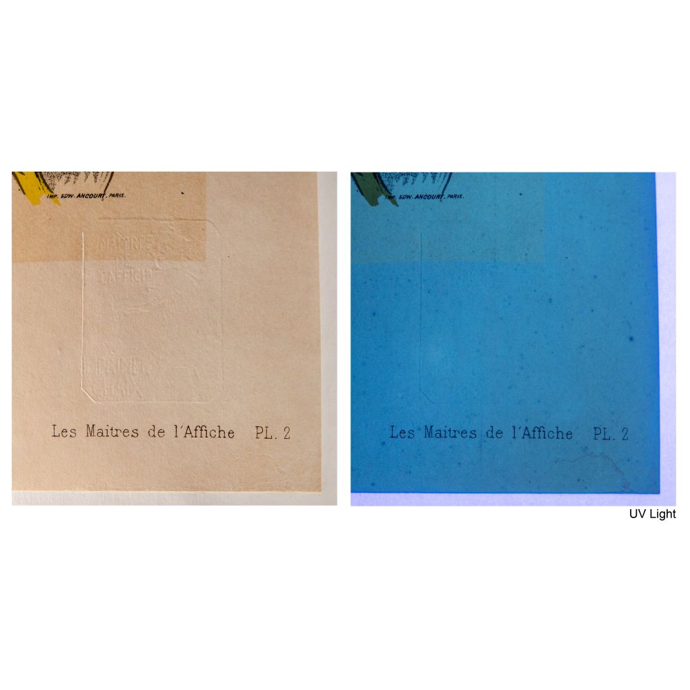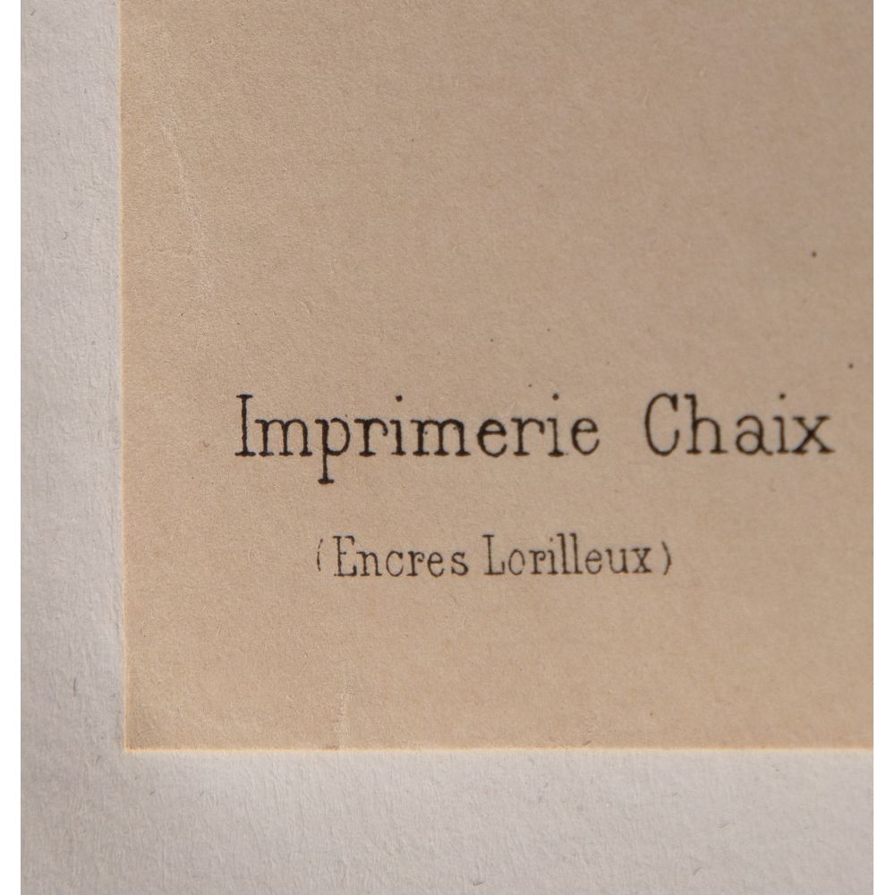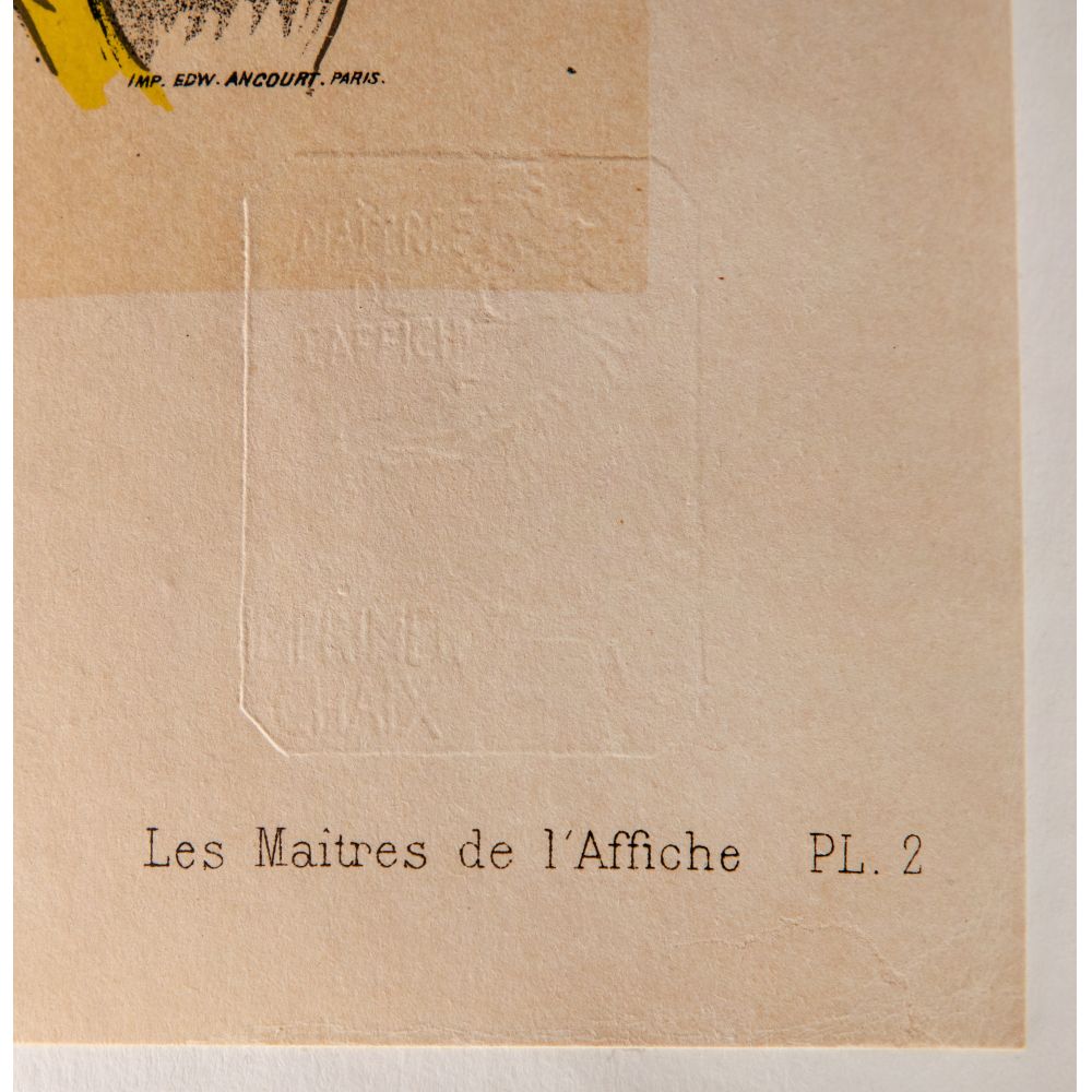 1895, plate #2 from volume #1 of “Les Maitres de Affiche” published by Chaix, Paris, having blind stamp lower right partially within image, mounted to linen-backed wove paper, unframed