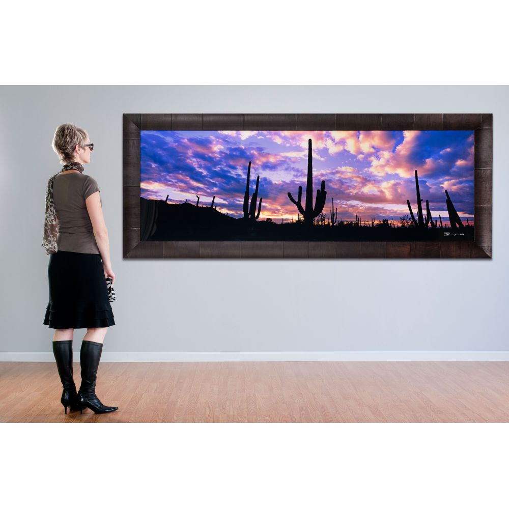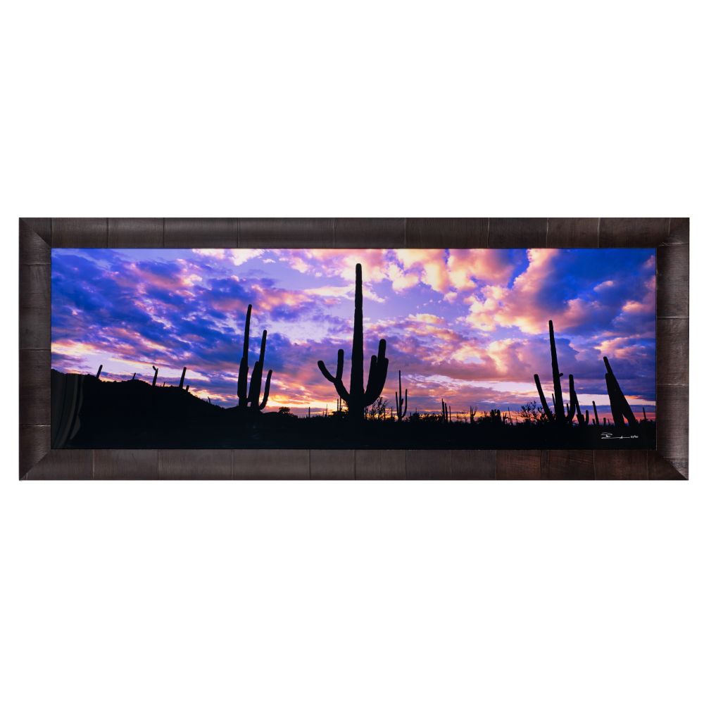 Undated, signed lower right and #123/950, depicting Saguaro cacti at dusk, acrylic mount in a black wood frame having hologram and artist studio label seen through cut out on back