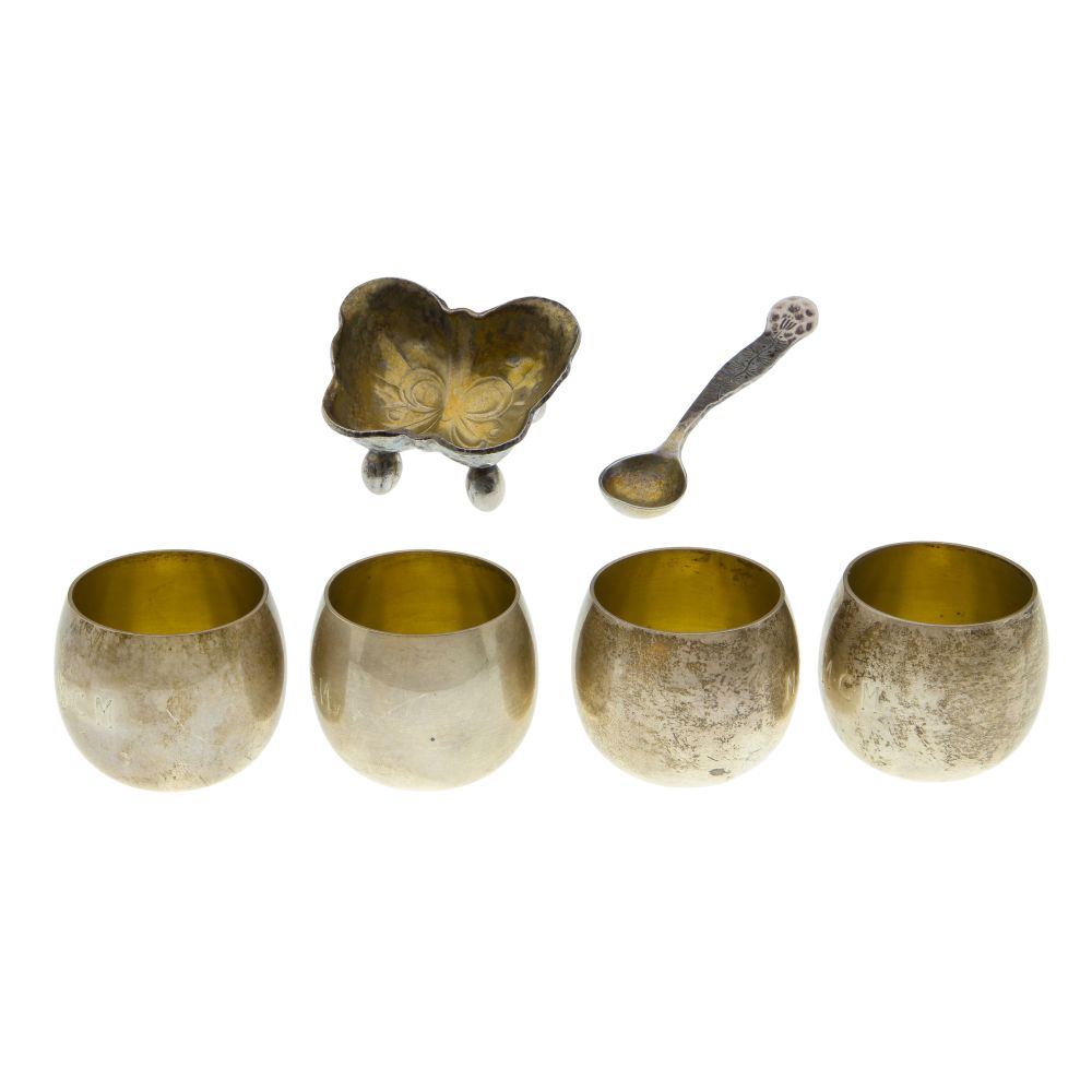 (6) items including an open butterfly salt cellar and a matching spoon, both having goldwash interior and a set of (4) cordials having goldwash interiors (marked “sterling” / “925” “Tiffany & Co.”)