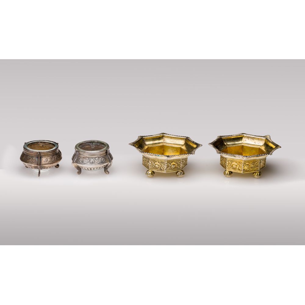 (4) total items, including a Nikolay Dubrovin gold-tone tapered octagon shape set (marked “H.D 1838” / “84”); together with a silverplate set