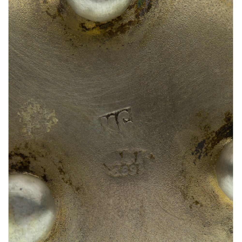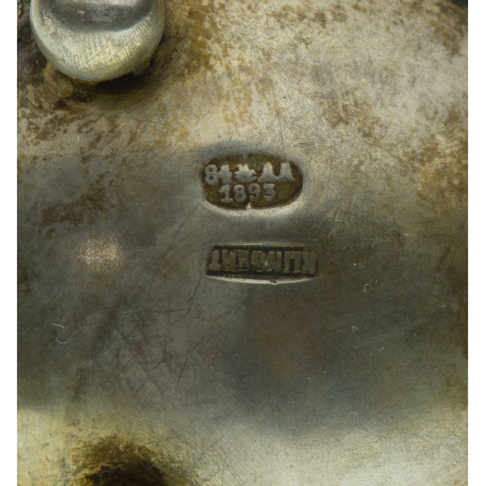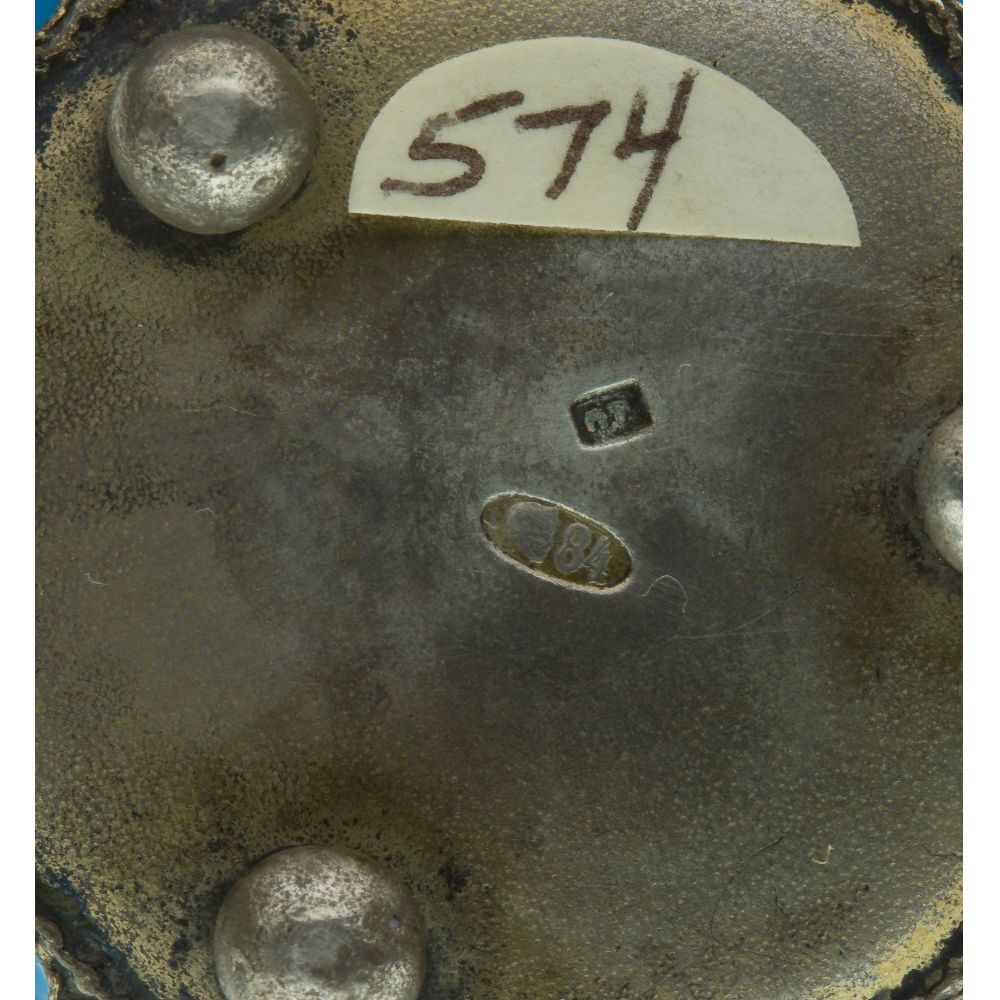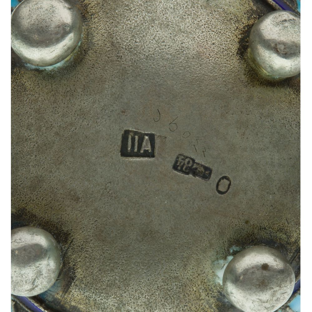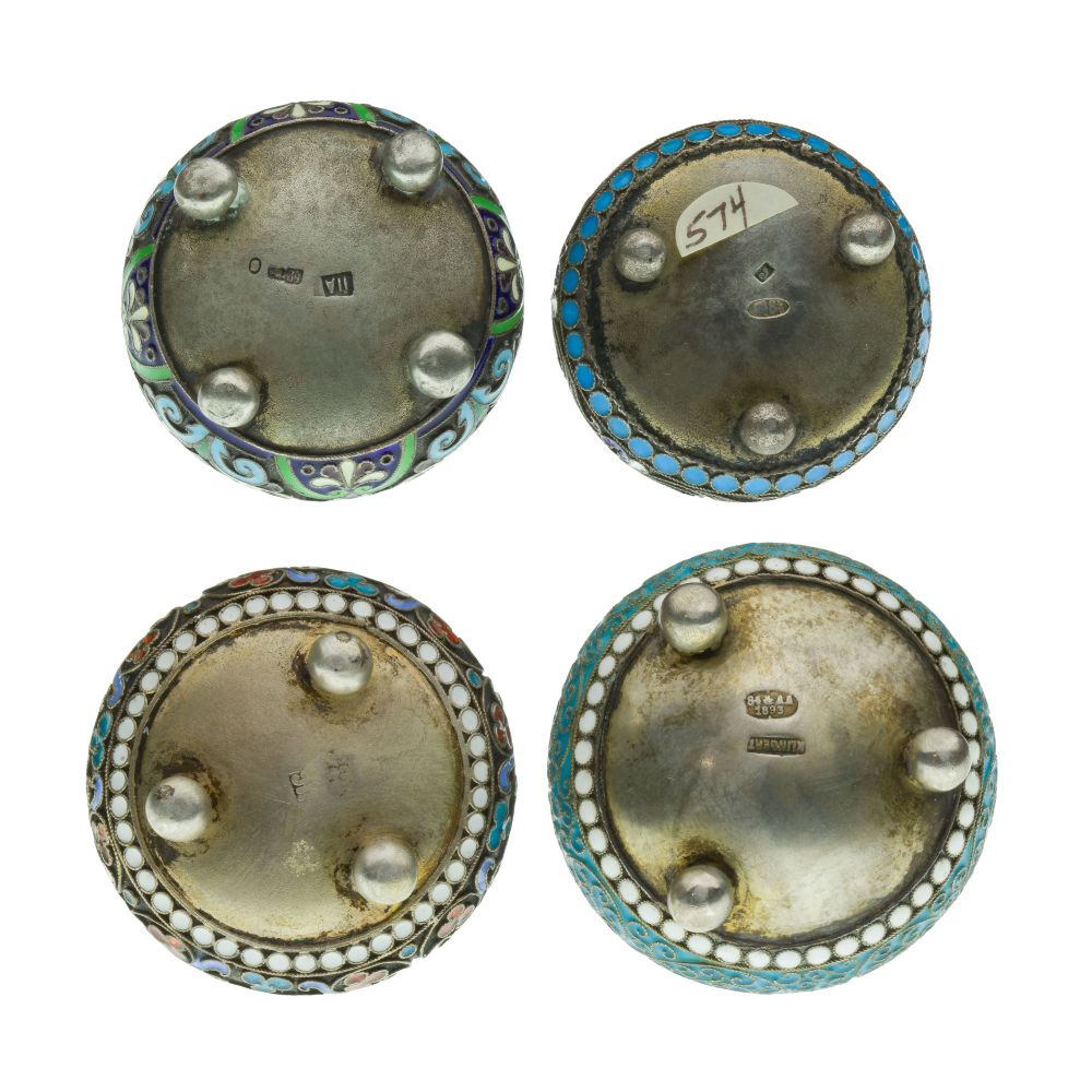 (4) items in Russian silver and cloisonne enamel of various sizes and colors, all having ball feet, one marked “Klinger 1893” having a goldwash interior, other markings faint (all marked “84”)