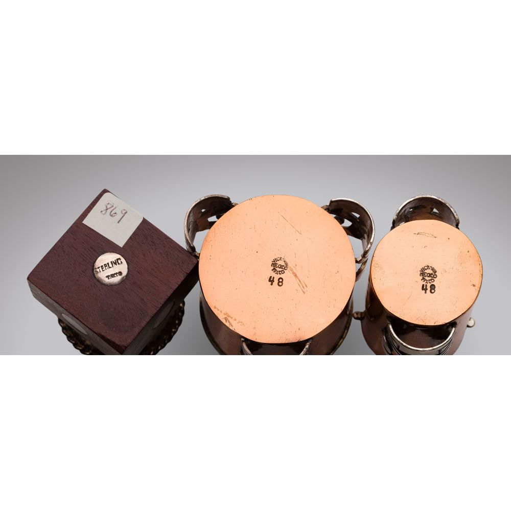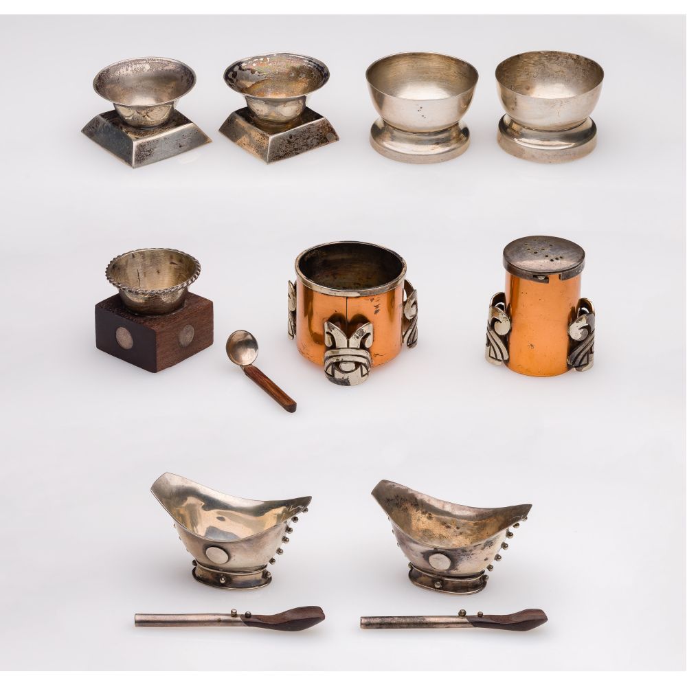 (12) total items including Spratling (2) round base and (2) square base (marked “sterling”) as well as (2) boats with (2) spoons; together with a copper salt and pepper set (marked “Victoria”) and a wood base with a spoon (marked “Taxco”)
