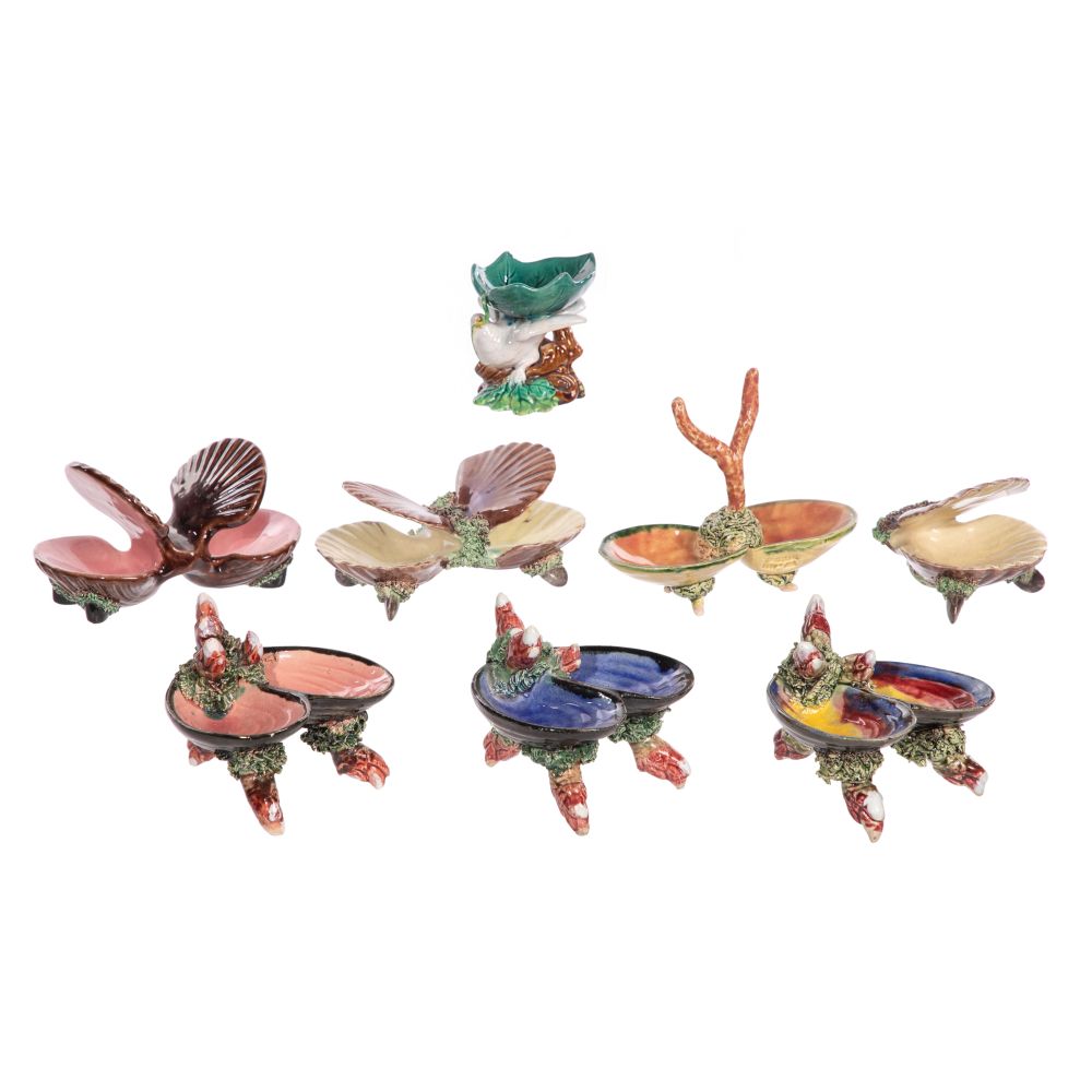 (7) items including (3) Palissy style double open cellars, (3) open clam shells and a bird and leaf