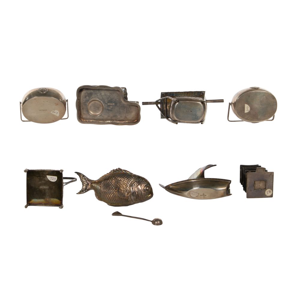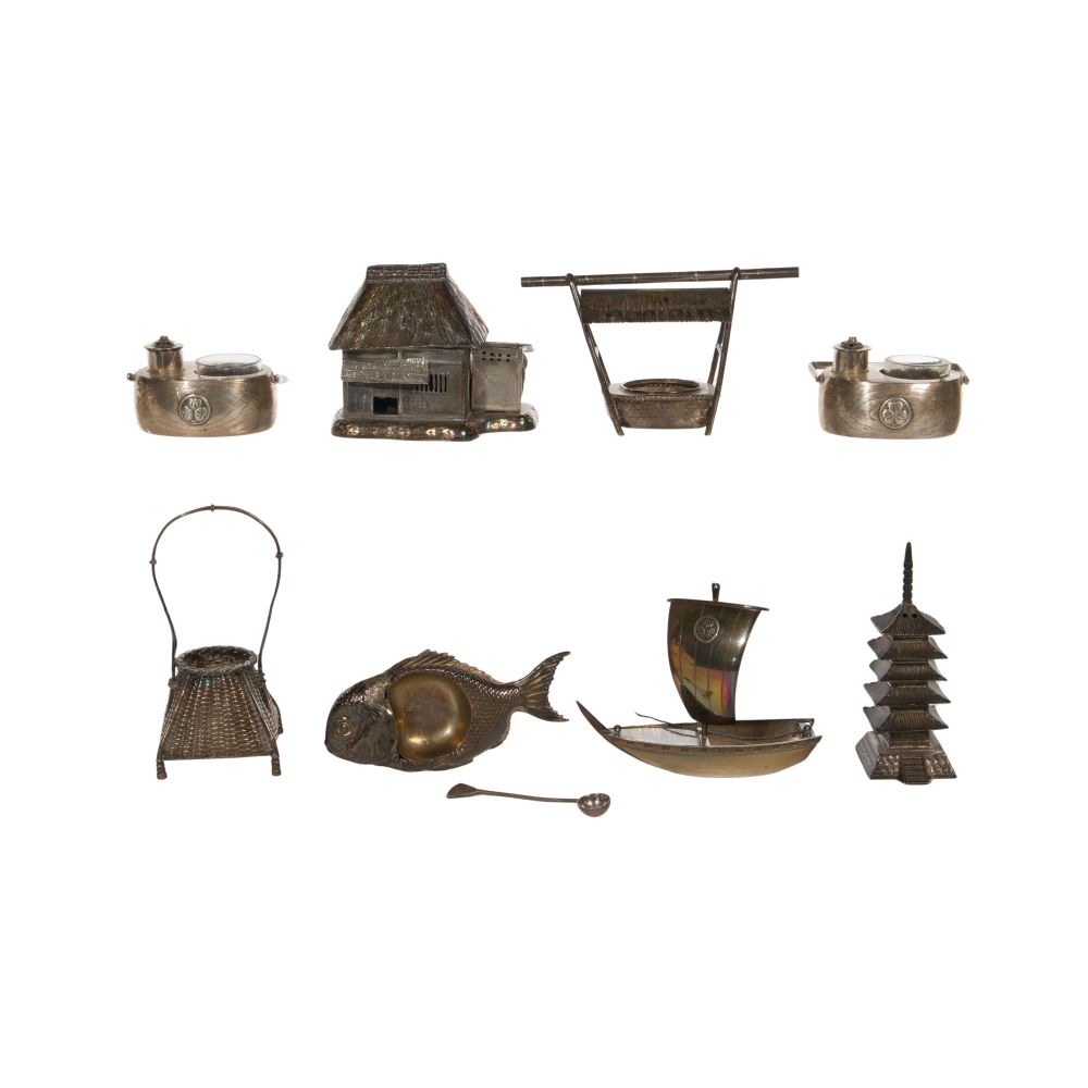 (8) items having Asian design including a boat, baskets and buildings, one having a spoon (all marked “sterling”)
