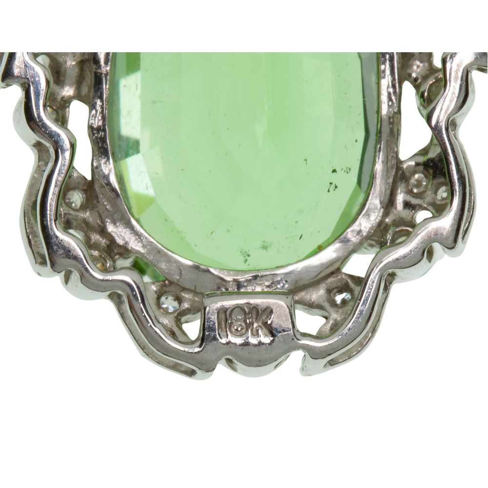 A link style necklace having round cut diamond spacers and a drop of a round cut yellow sapphire and an oval cut green garnet, both surrounded by round cut diamonds (marked “18k” on tongue of clasp)