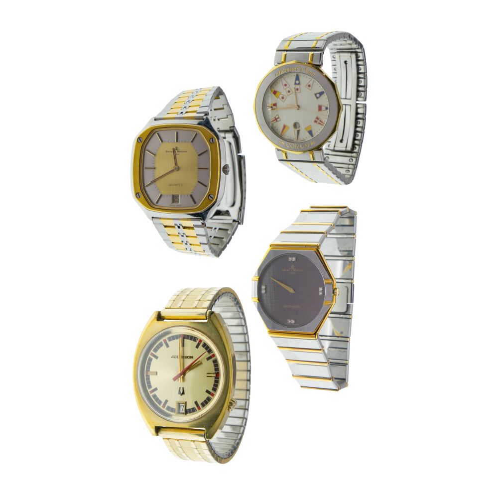 (4) items, Baum & Mercier including a two-tone 1830 (having original papers) and an Ovart-Guard as well as a Corum Admiral’s Cup and an Accutron, all having batteries attached to backs