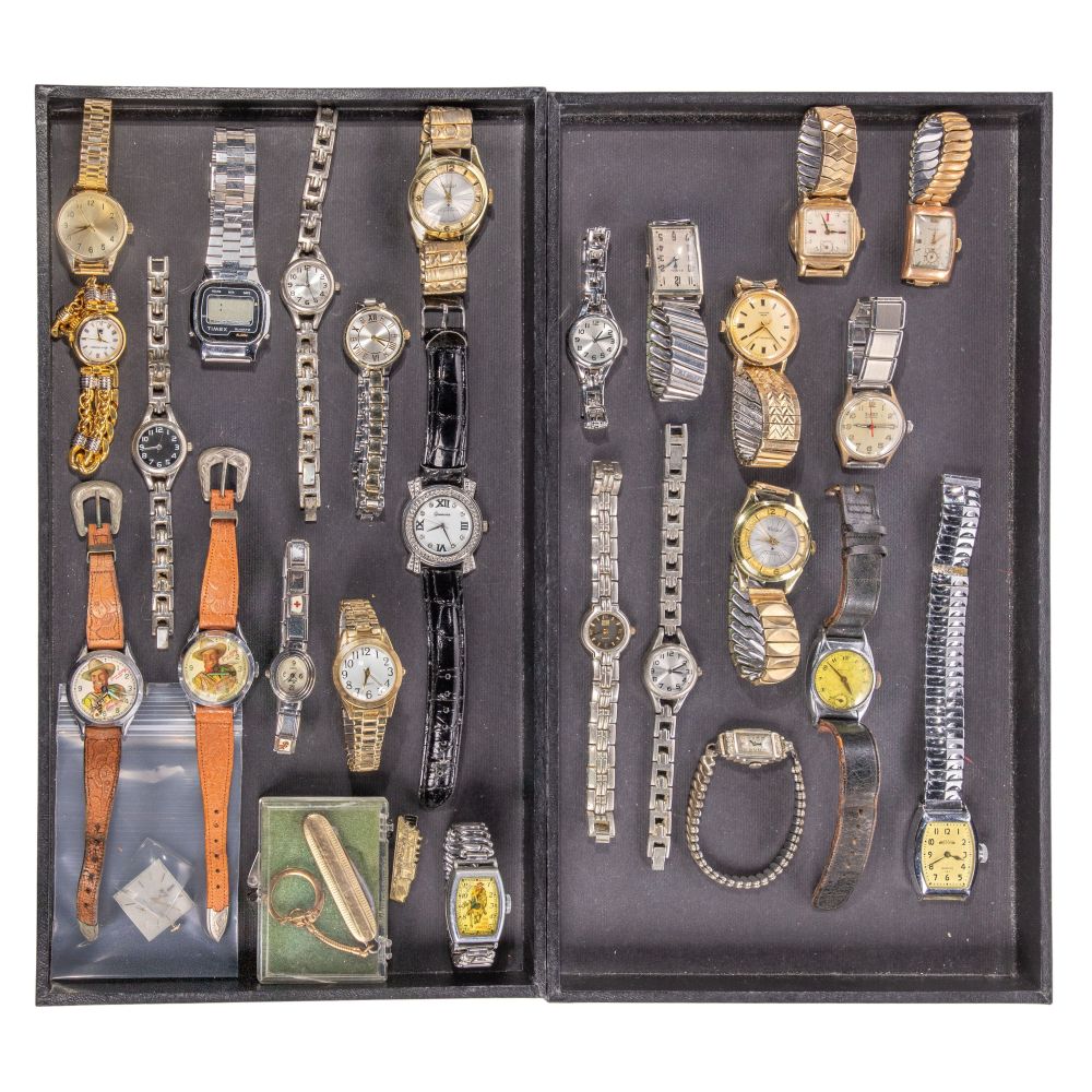 Condition: overall light wear consistent with normal use, scratches, nicks, discoloration, broken and missing pieces, dirt accumulation overall, not running when tested, Autry having missing crystal, broken hands, Rogers having scratched dial, bands having wear overall, not including display trays, overall light wear consistent with normal use, scratches, nicks, discoloration, broken and missing pieces, dirt accumulation overall, not running when tested, Autry having missing crystal, broken hands, Rogers having scratched dial, bands having wear overall, not including display trays